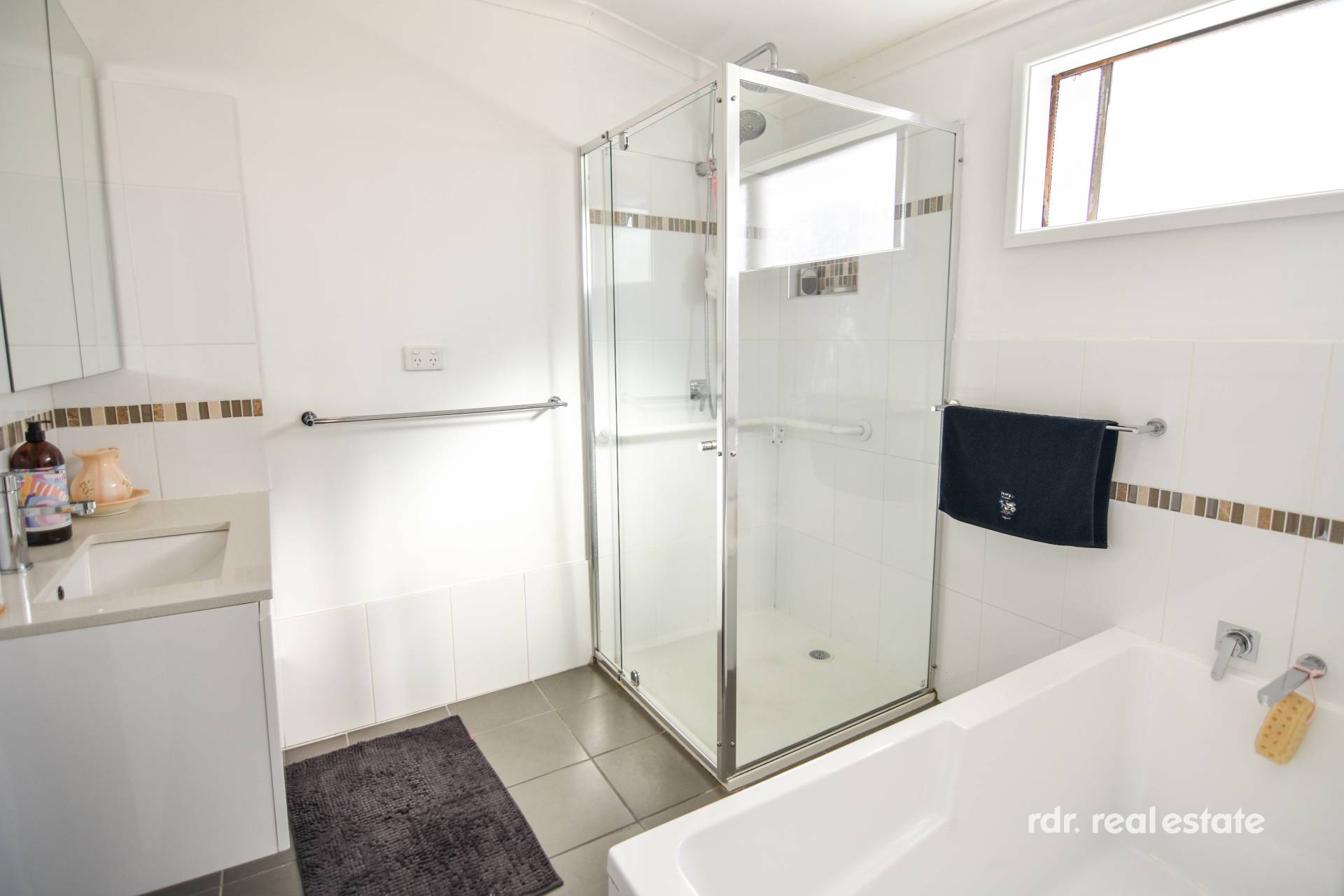 Updated, modern bathroom with both a shower and bathtub, vanity and separate toilet. Next door, the walk-in linen press offers a great storage solution for your sheets, towels, and other belongings.