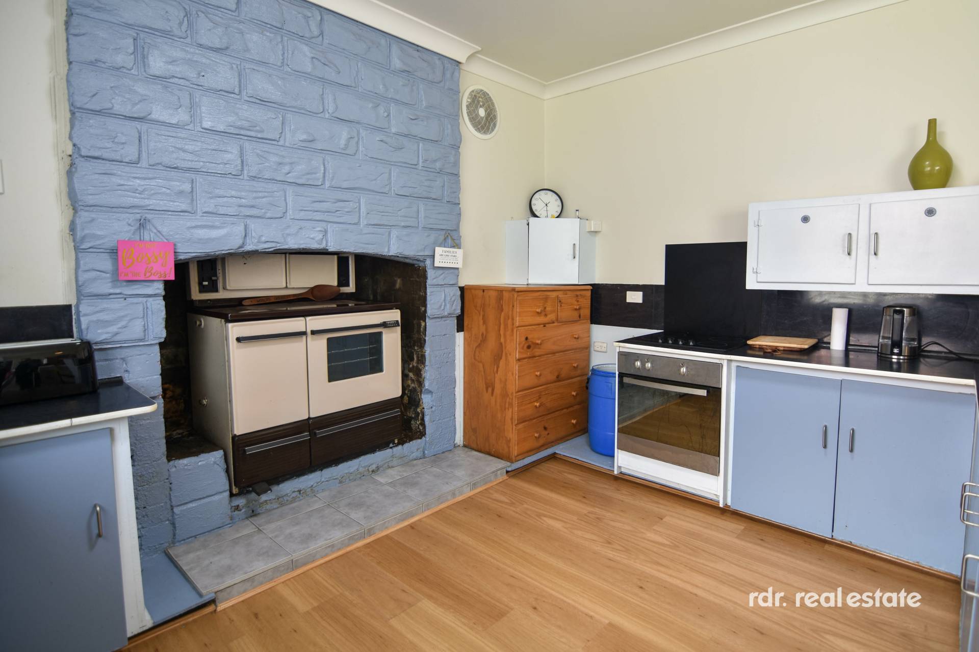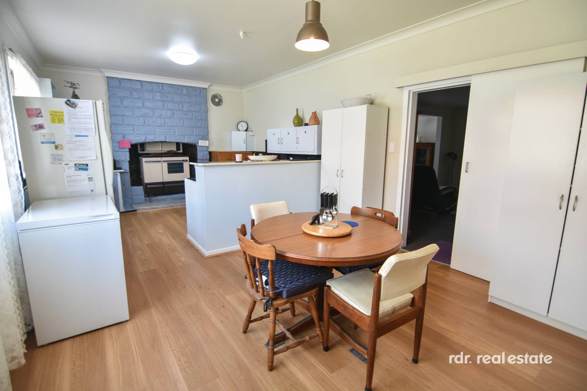 Open plan kitchen and dining is centrally positioned between both the lounge rooms. Blending original features with modern conveniences, this kitchen contains an antique wood combustion stove, electric oven and cooktop, functional bench space, and an abundance of storage cupboards.