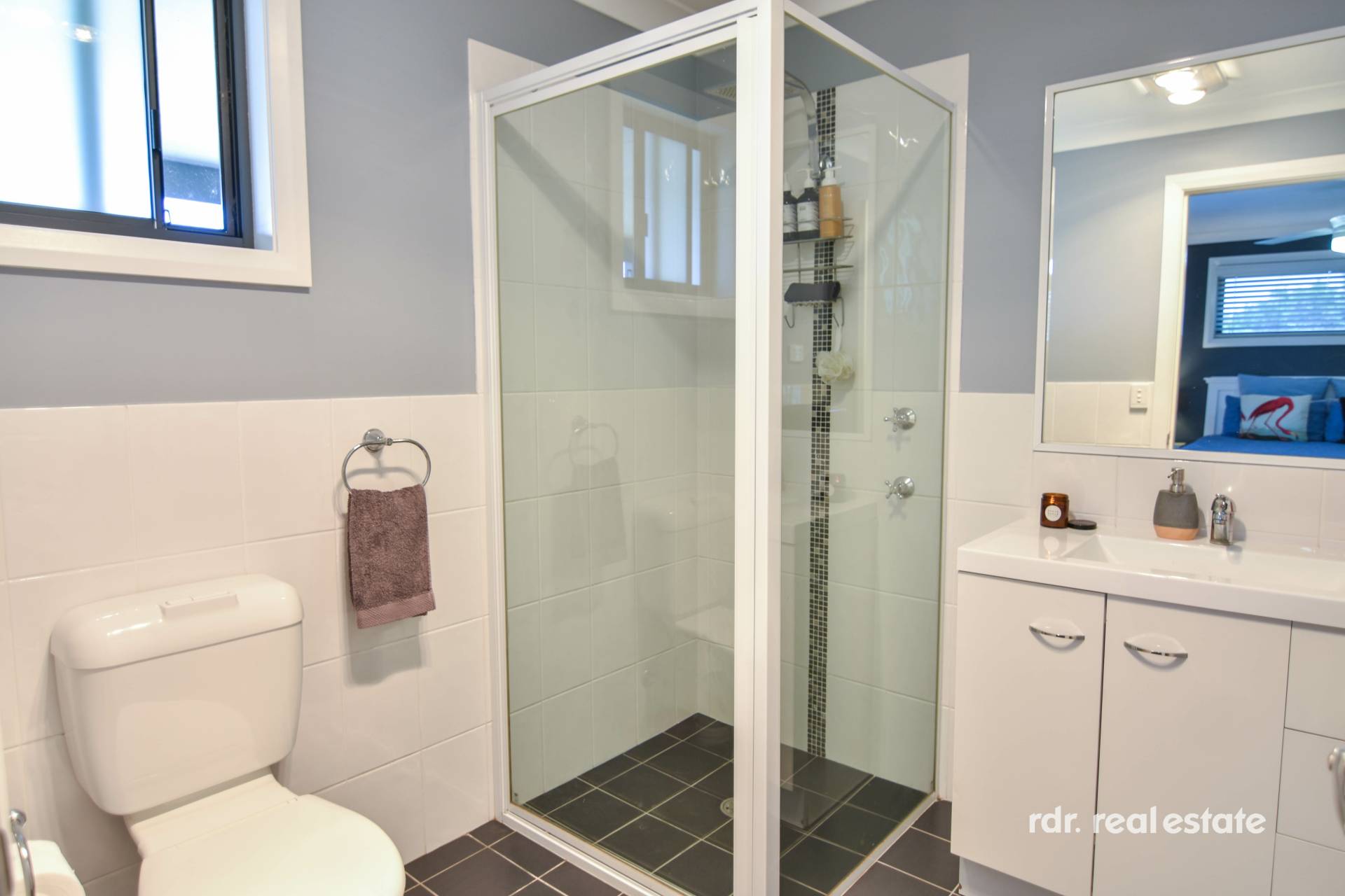 The main bathroom combines style and practicality, and comprises of a shower, vanity, and toilet.