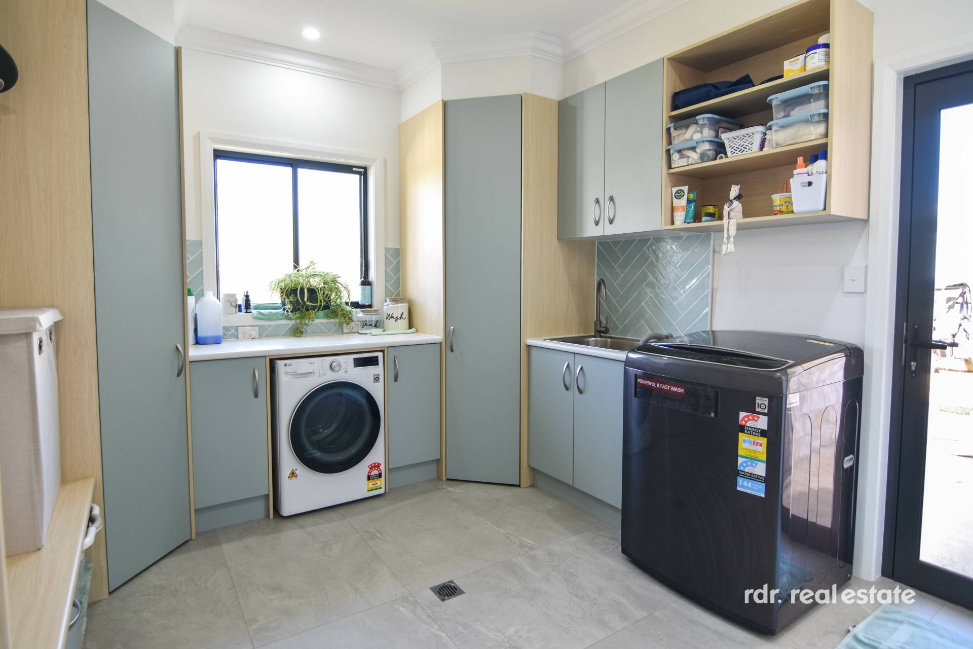 The master bedroom is situated at one end of the home and has a walk-through robe and luxurious ensuite. Built-in robes to 3 bedrooms, and the 5th bedroom can easily be utilised as an office or nursery. Family bathroom comprises of glass semi-frameless shower, bathtub, vanity and floor-to-ceiling tiles. Separate powder room. Generous laundry with ample storage and access to your garage and the outdoors.