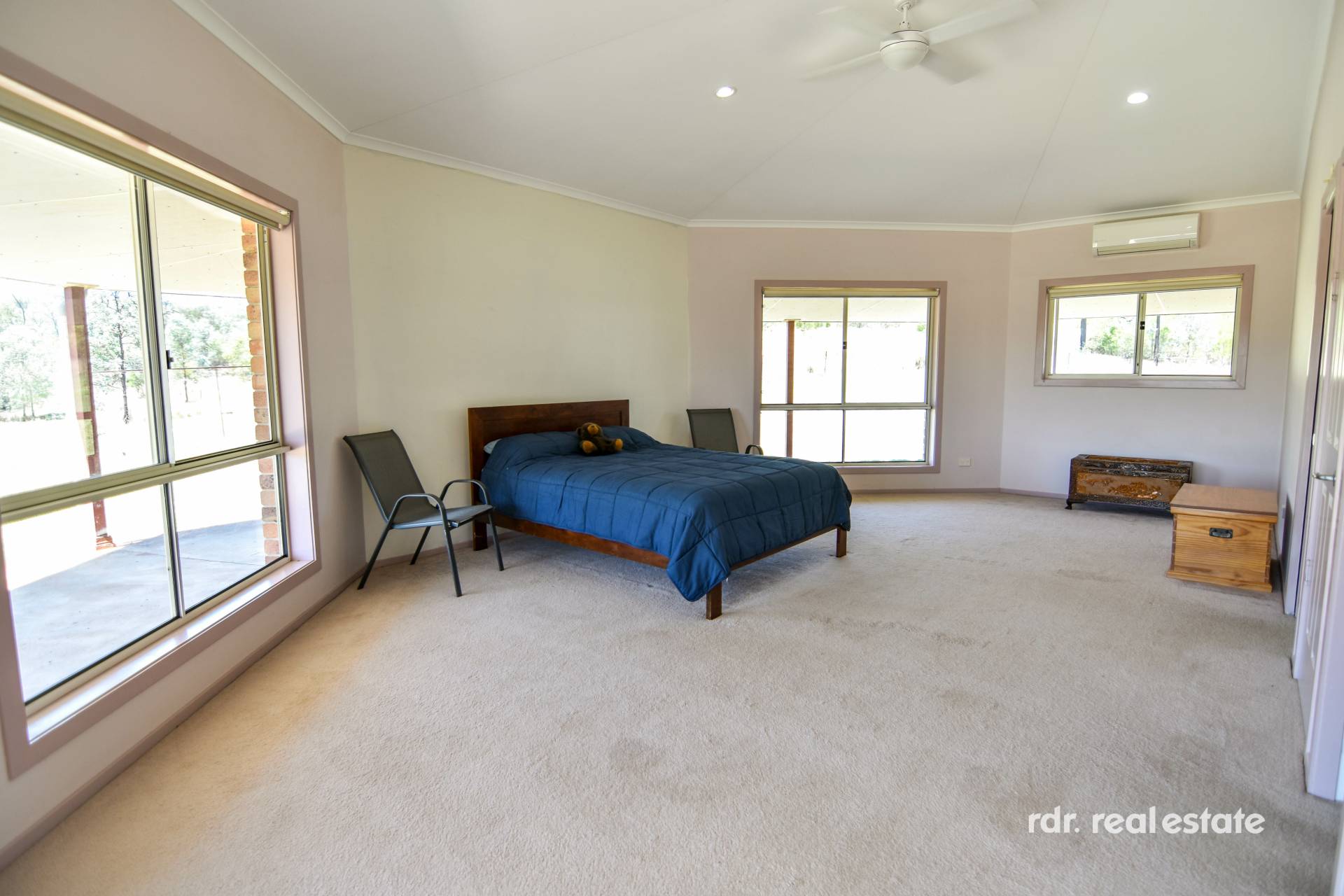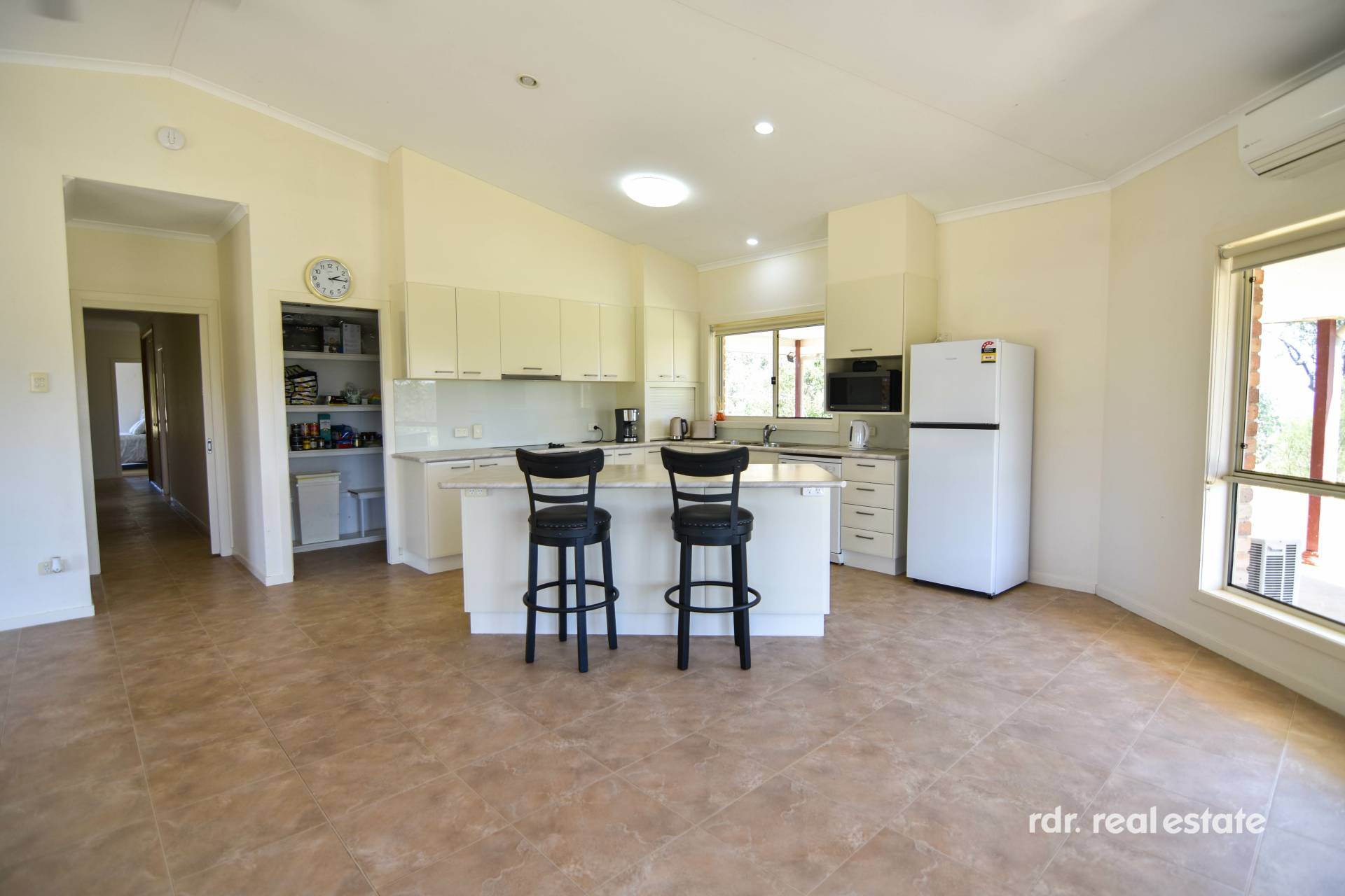 IMPROVEMENTS:  * 5 bedroom, 2 bathroom homestead built in 2005. Steel frame construction, with 9ft ceilings throughout, and 11ft raked ceiling in kitchen/family area & main bedroom. Reverse cycle air conditioning & ceiling fans in every room. Glass sliding doors & floor-to-ceiling windows throughout allow natural light and views in. Kitchen contains generous walk-in pantry, dishwasher, induction 4 burner cooktop & oven, appliance cupboard with roller door, and island bench.