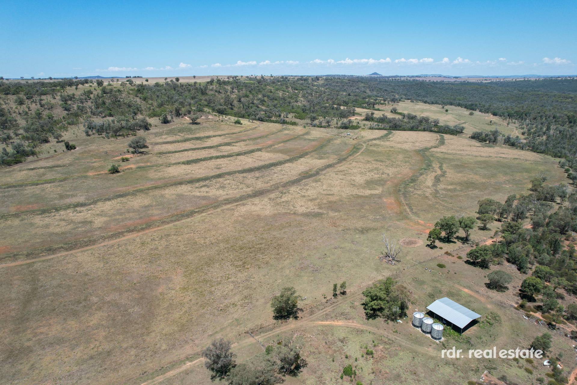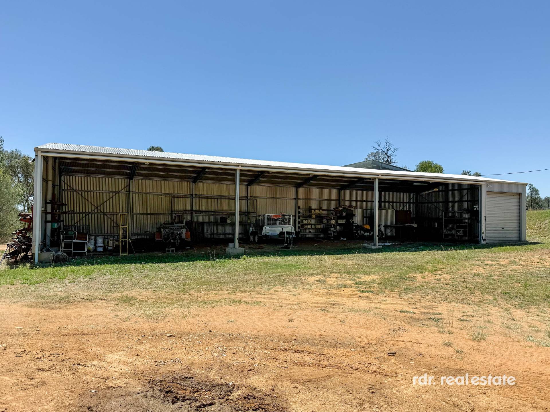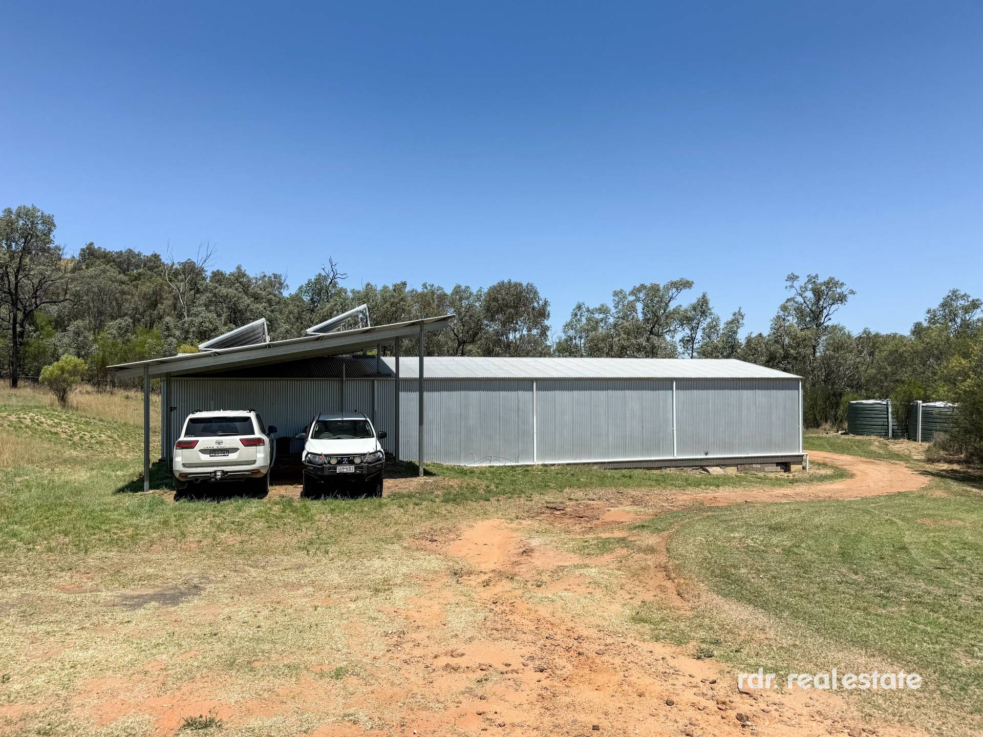 MACHINERY SHED:  33m x 12m machinery shed with power, shower, toilet, laundry tub & attached 2 car carport. 2 x 5,000gal rainwater tanks.
