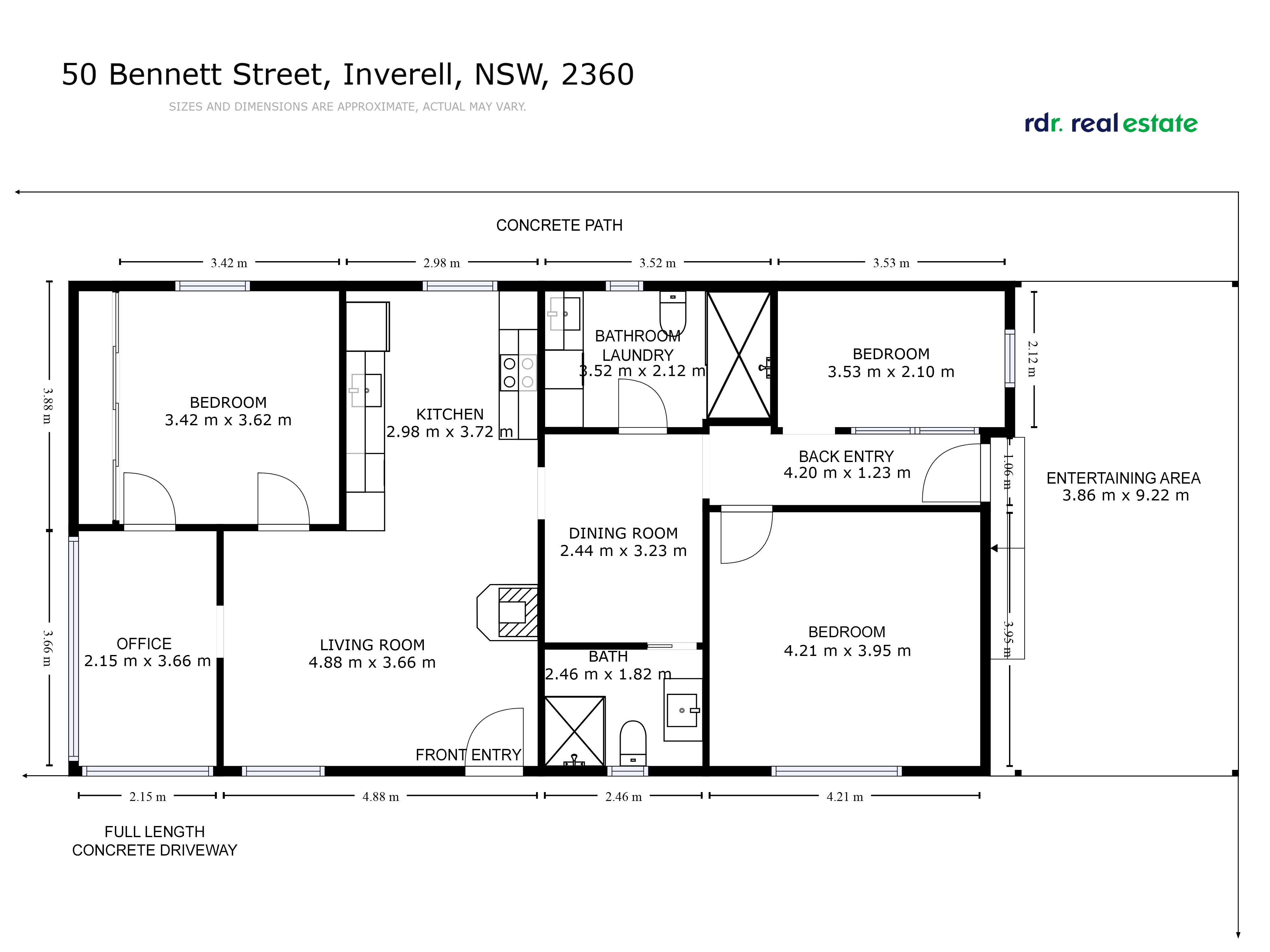 3 comfortable bedrooms, one featuring built-in robes and another with polished concrete flooring, plus there is also a dedicated office for those working or studying from home. 2 stylish bathrooms, each with a walk-in shower, toilet and gas hot water, provide modern convenience, with the second conveniently combined with the laundry.