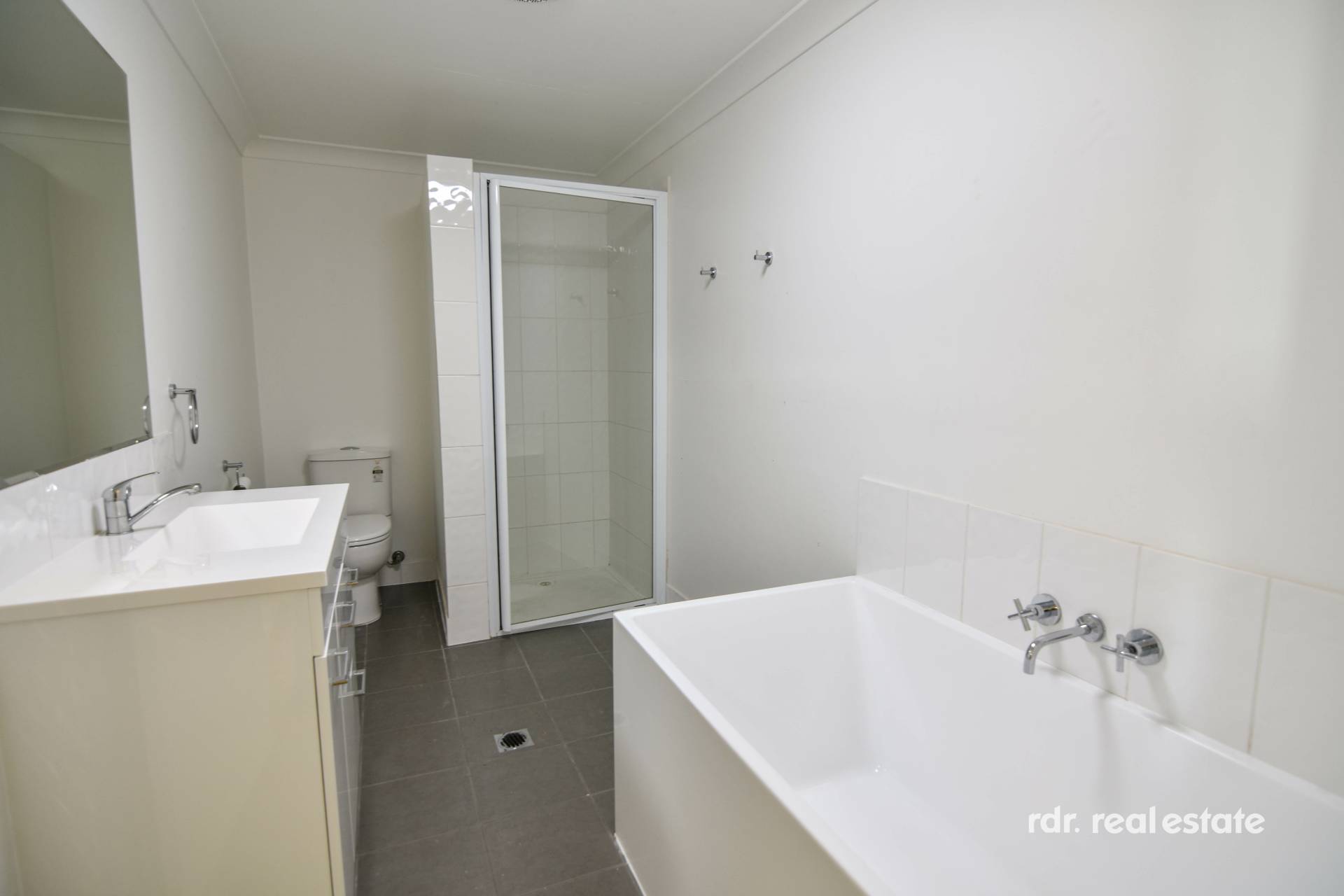 The updated bathroom is fresh and modern, with a deep soaking bathtub, shower, vanity, and toilet. A second toilet is conveniently located within the laundry, adding to the home’s functionality.