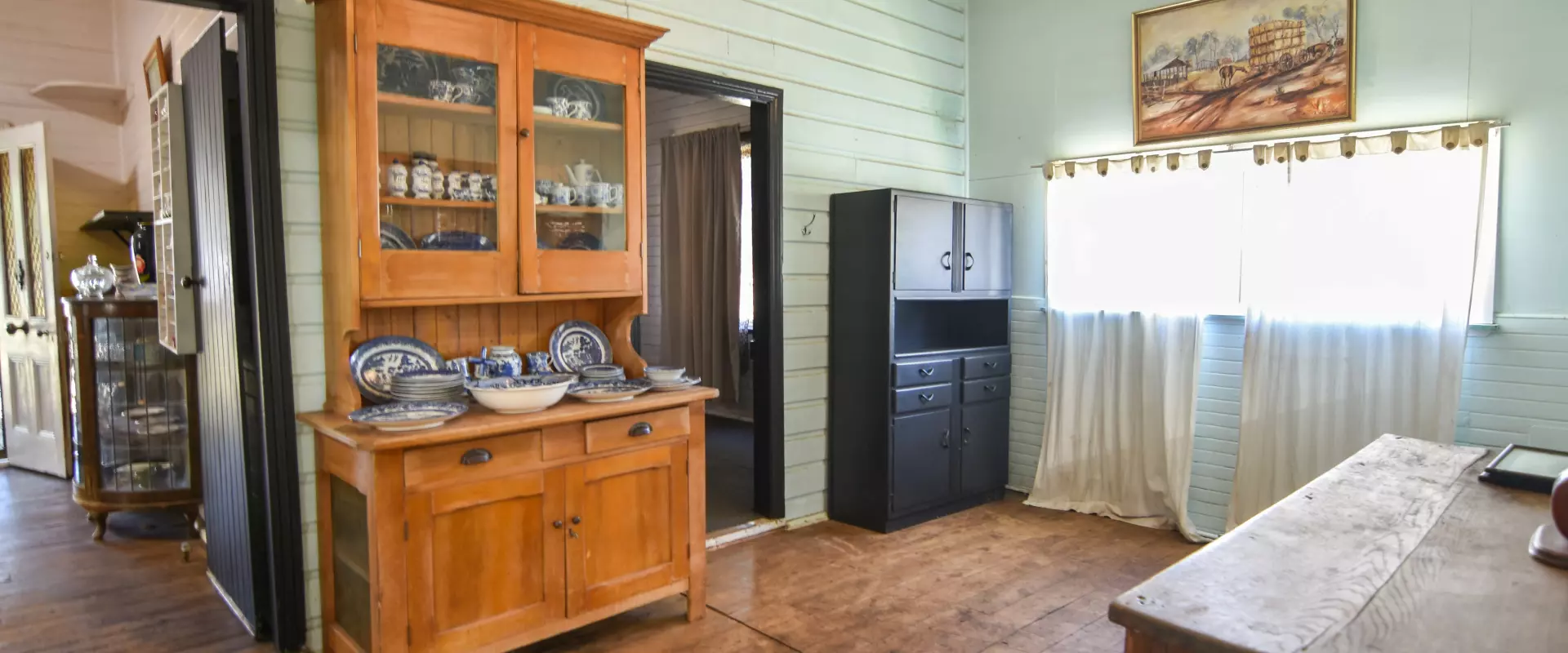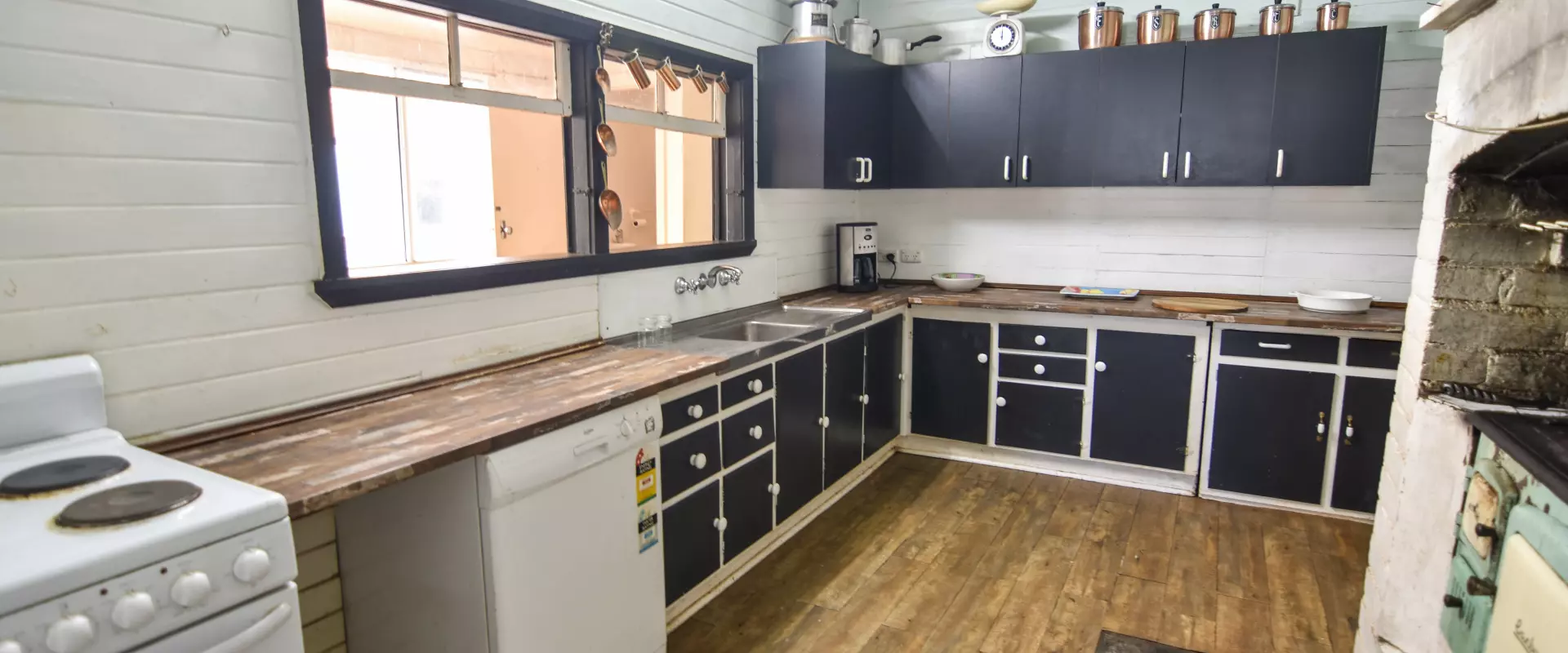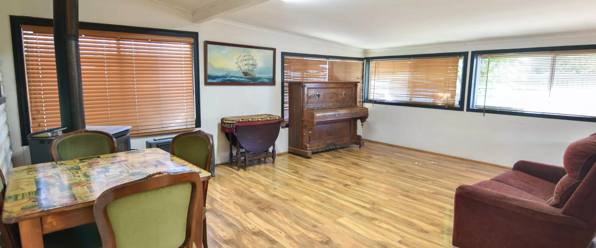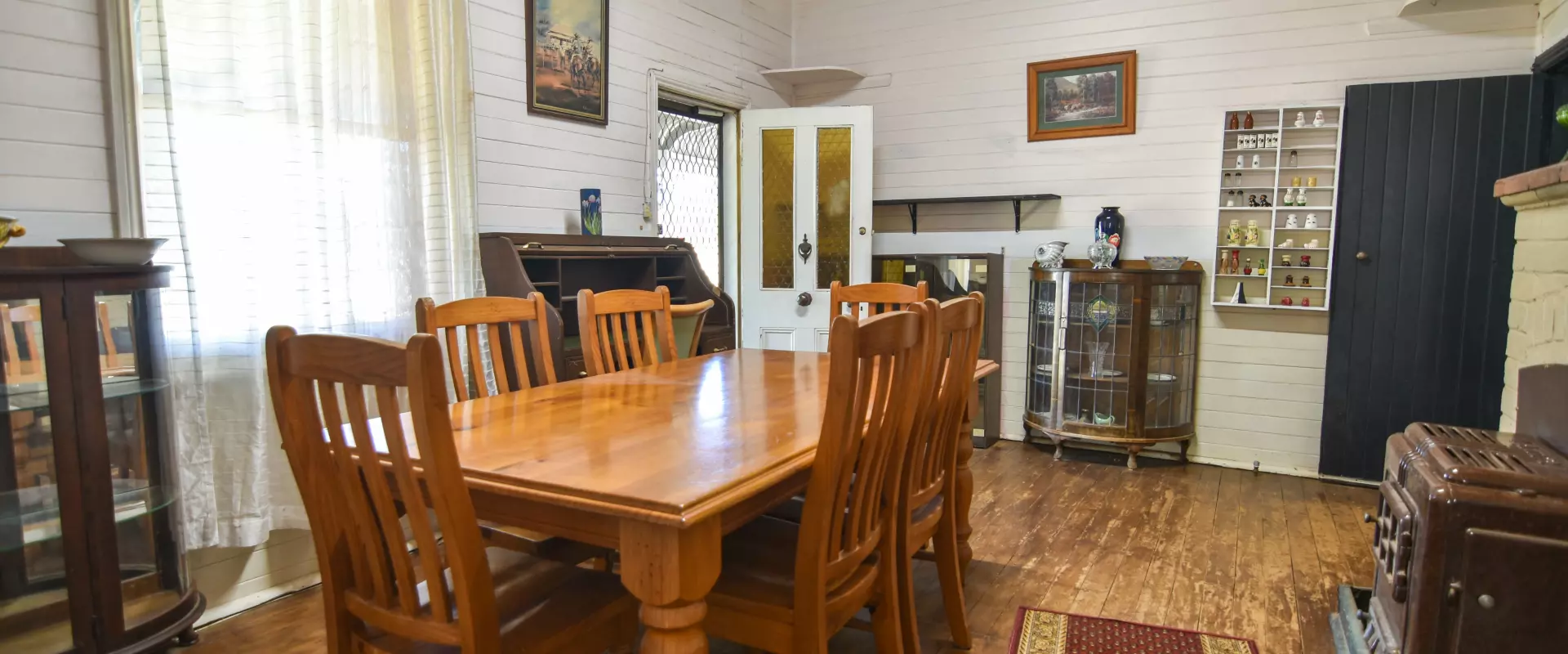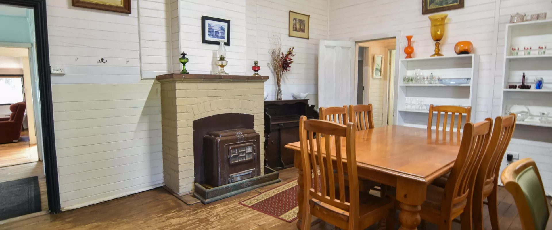 The bright and sunny living and dining area immediately creates a sense of warmth and comfort, flowing through to the country-style kitchen. Here, original charm meets modern convenience, featuring a classic Metters Canberra slow combustion stove, dishwasher, electric stove, and adjoining living space complete with a cosy wood heater.