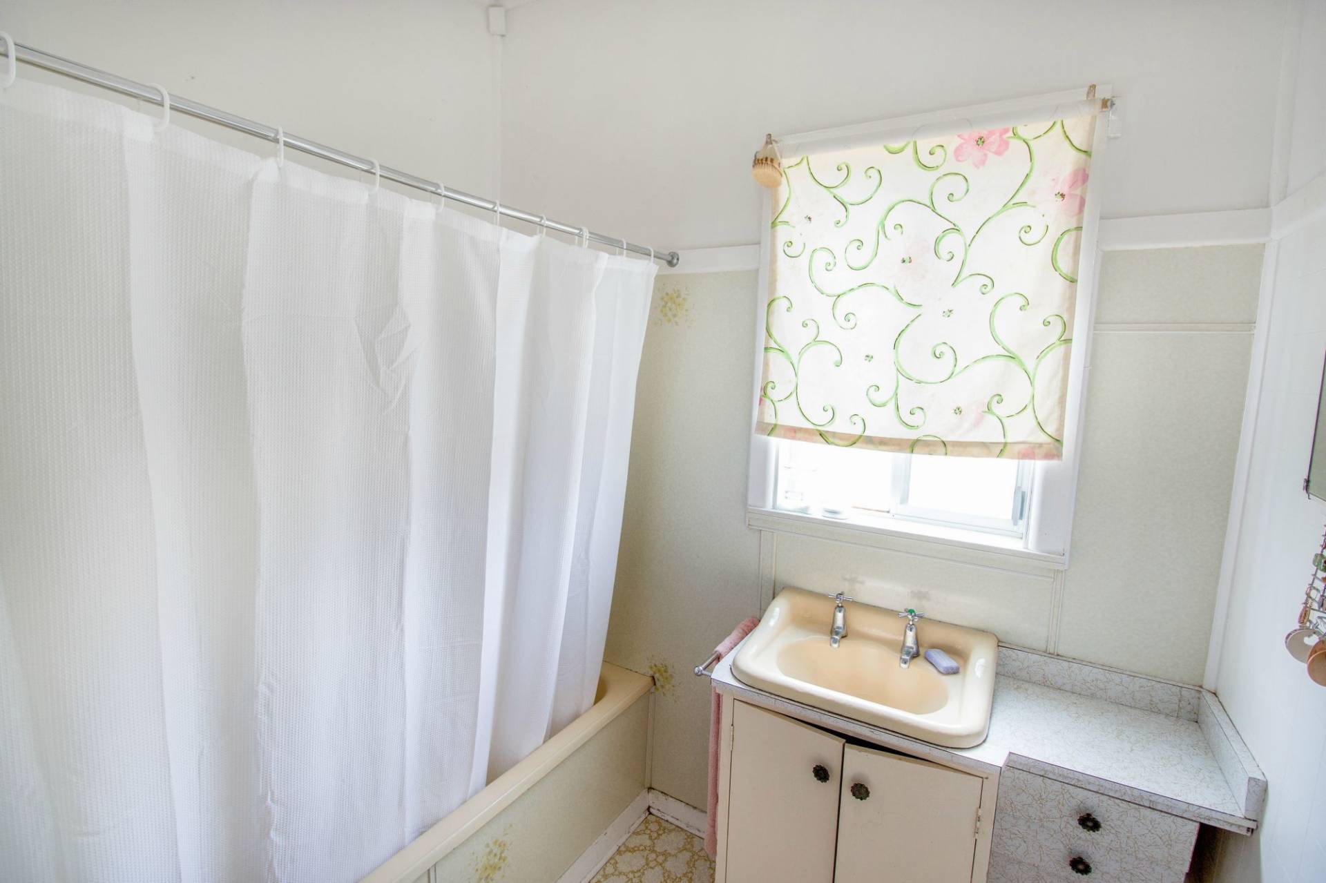 * Bathroom with enamel wash basin, enamel bath tub with overhead shower, lino flooring.