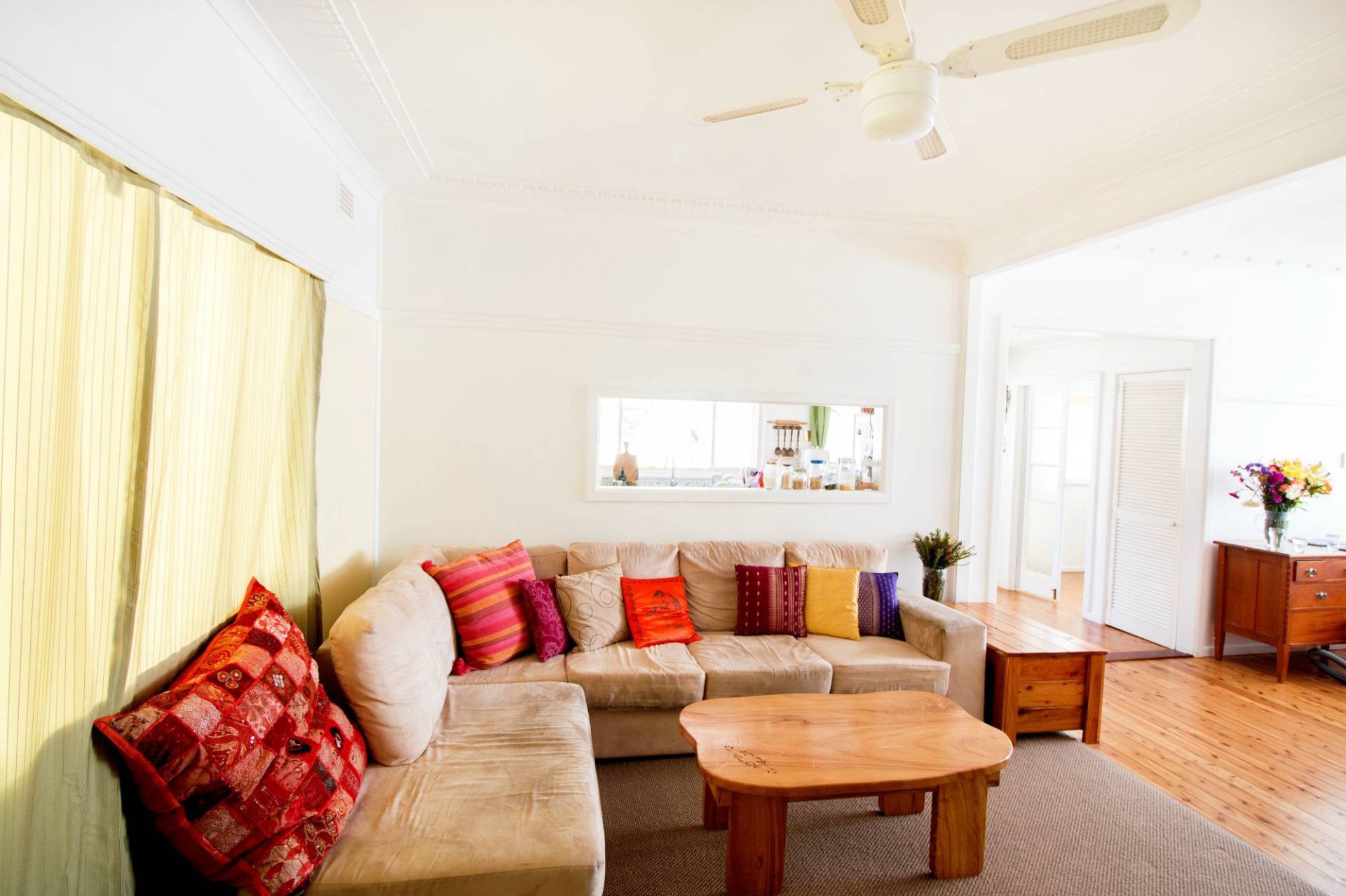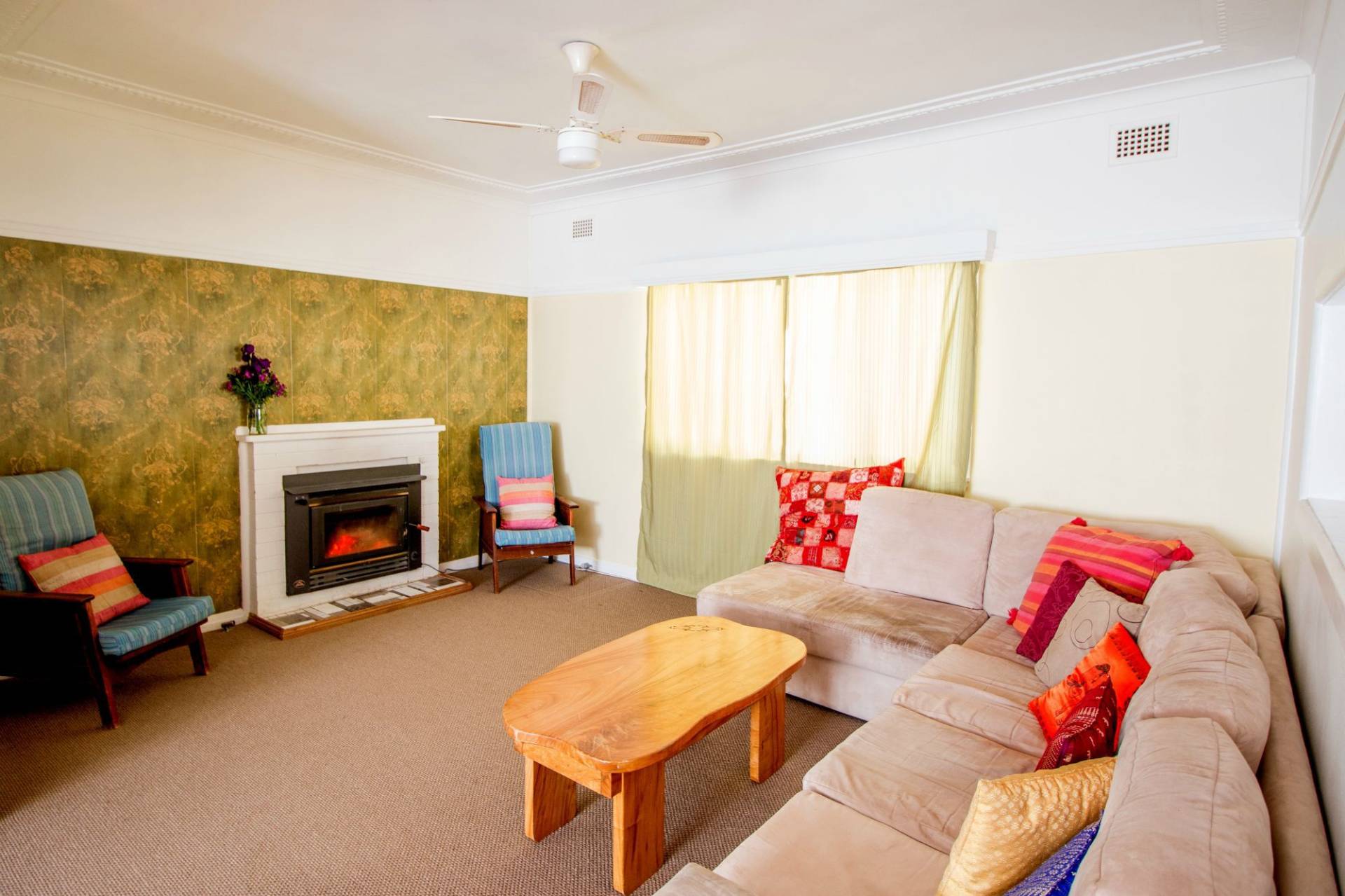 * Cosy open plan lounge room boasting decorative cornices, feature wall with vintage style wall paper, Saxon wood heater + gas point, ceiling fan, open window to the kitchen, carpet flooring.