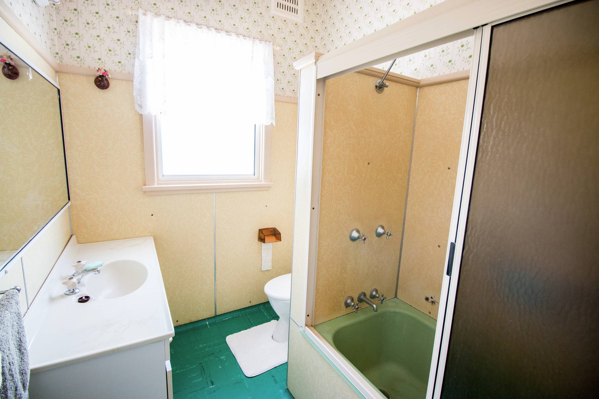 * Tidy bathroom offering built-in bathtub with glass screen & overhead shower. Single Vanity. Toilet.