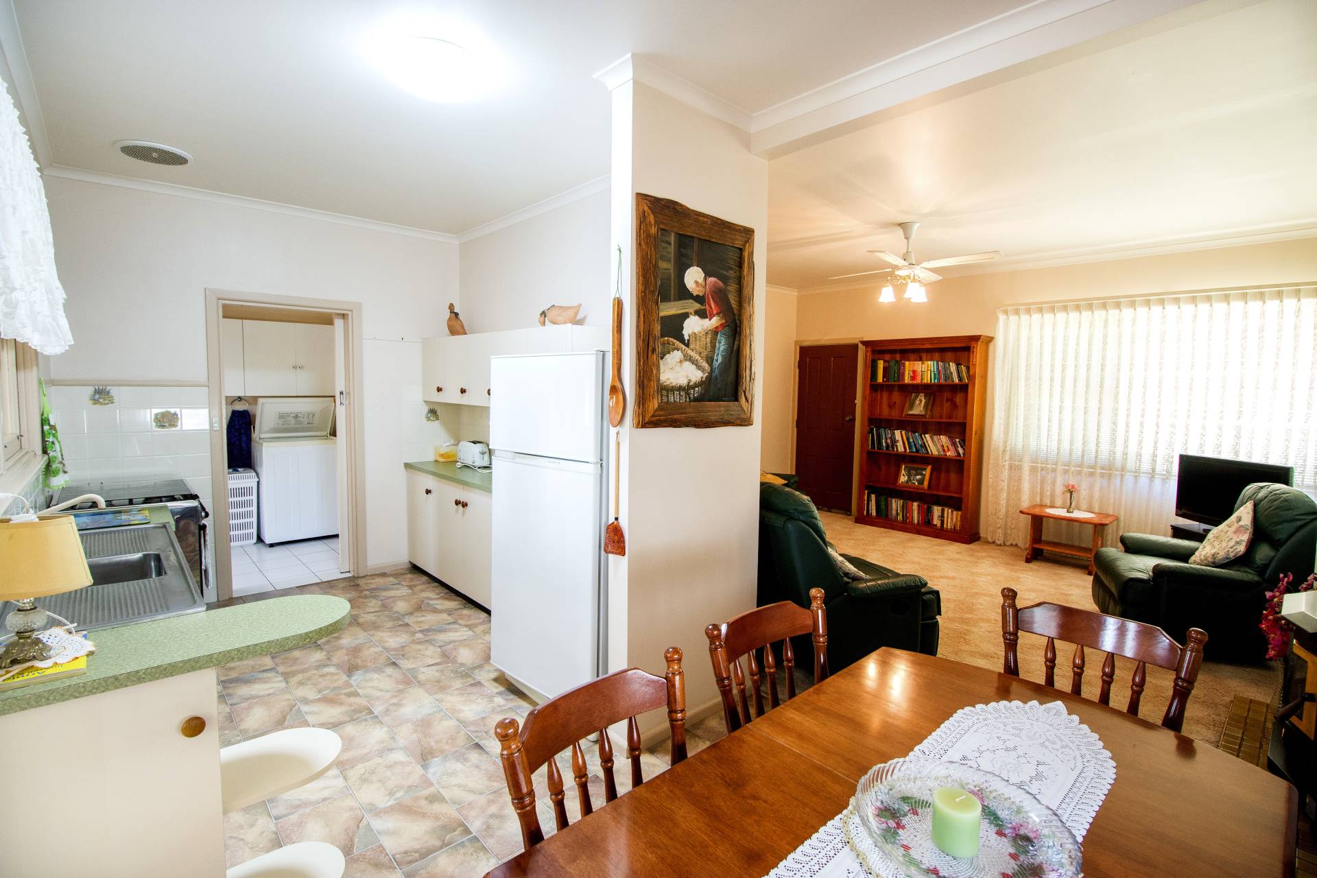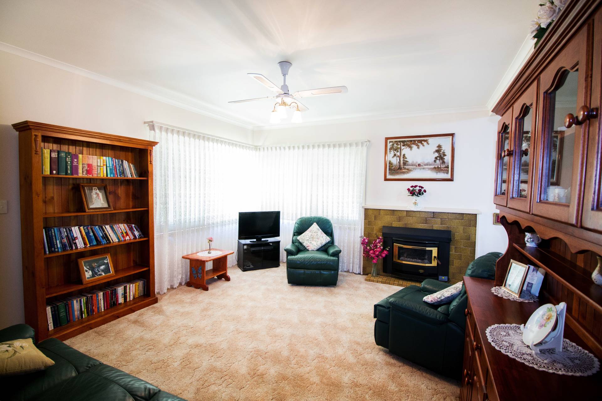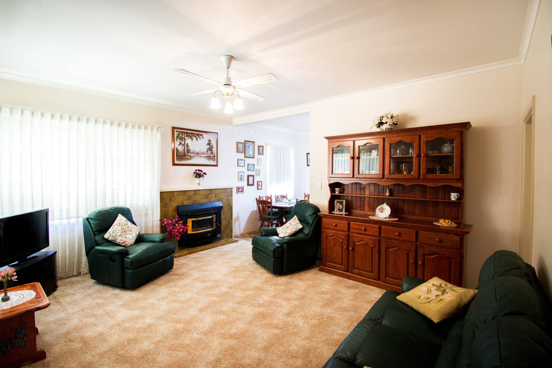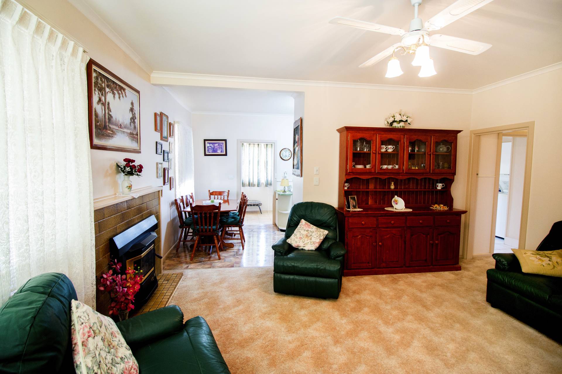 * Spacious living room situated off the front entrance, complete with: Timber-look Gas Heater, high ceiling, ceiling fan, carpet flooring. Open to the dining area.