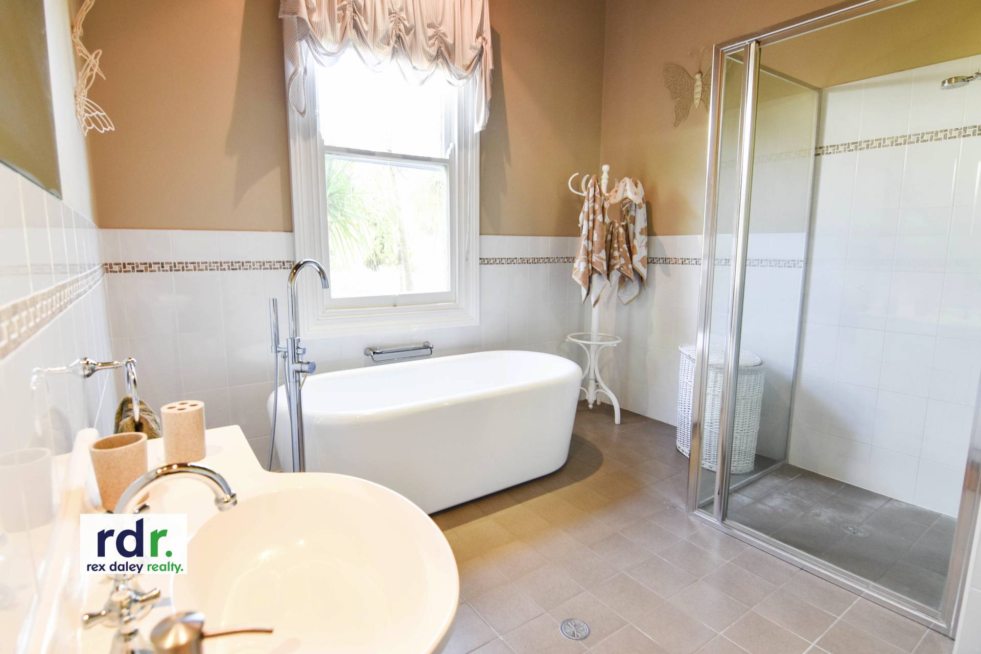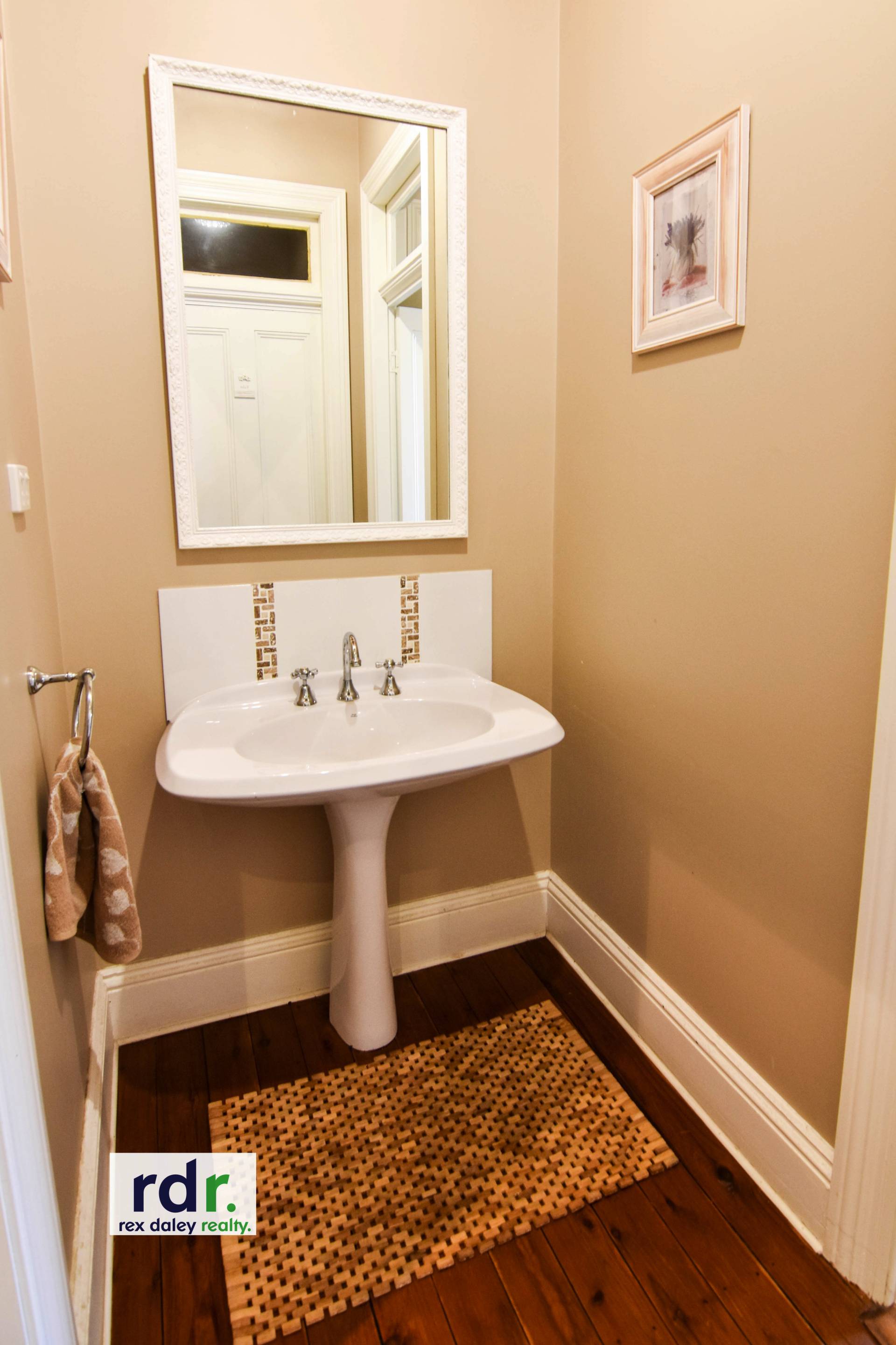 The grandeur of the main bathroom exudes nothing but luxury, with freestanding water spout over large bathtub, generous shower and vanity with bevelled mirror. Separate to main bathroom, original pedestal hand basin.
