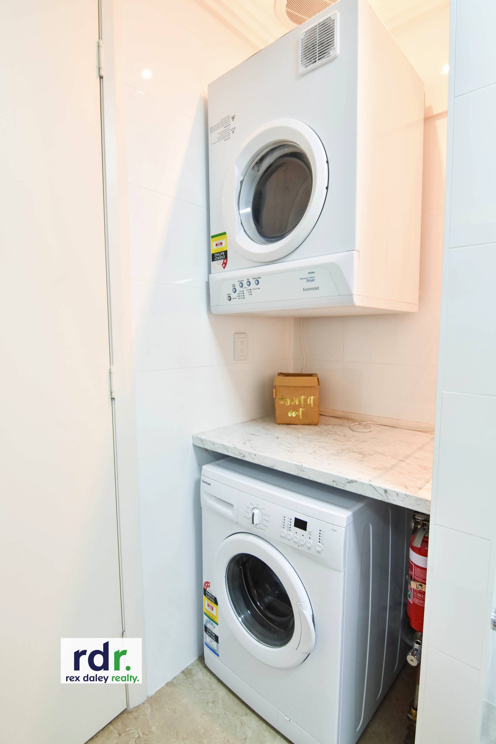 You will fall in love with your sleek, tiled bathroom comprising of walk-in shower with luxurious rain shower head, large vanity, mirrored medicine cabinet, beautiful chrome fittings and toilet. You won’t mind the task of washing in your laundry with stone benchtop cleverly tucked away behind the bathroom door. Skylight provides natural light, with the option of downlights at night.