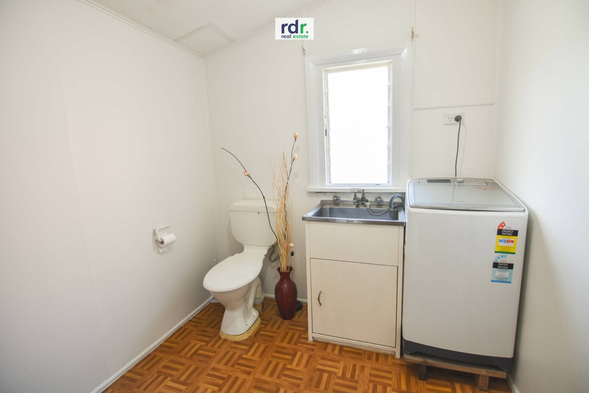 Family bathroom comprises of shower, vanity and toilet, with a second toilet located in the laundry.