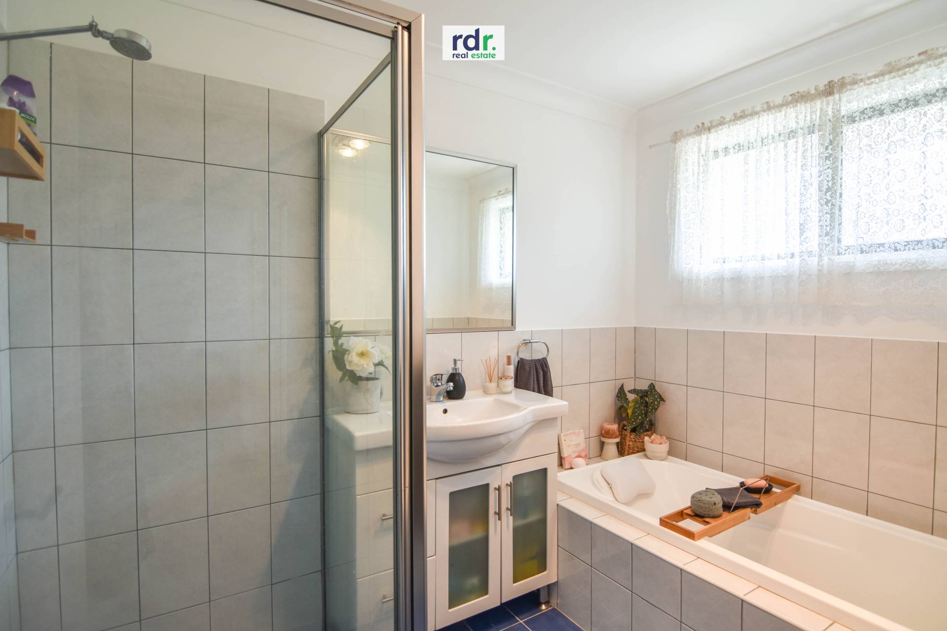 Main tiled bathroom comprises of bathtub, shower, vanity and separate toilet.