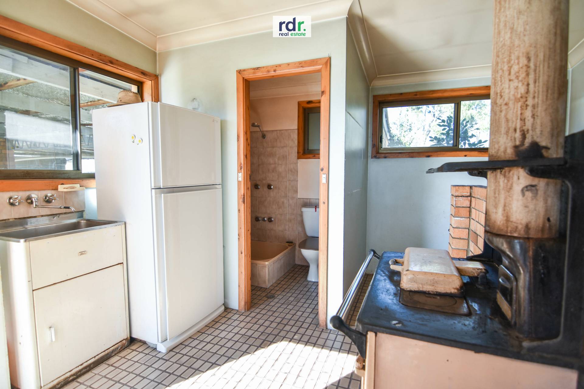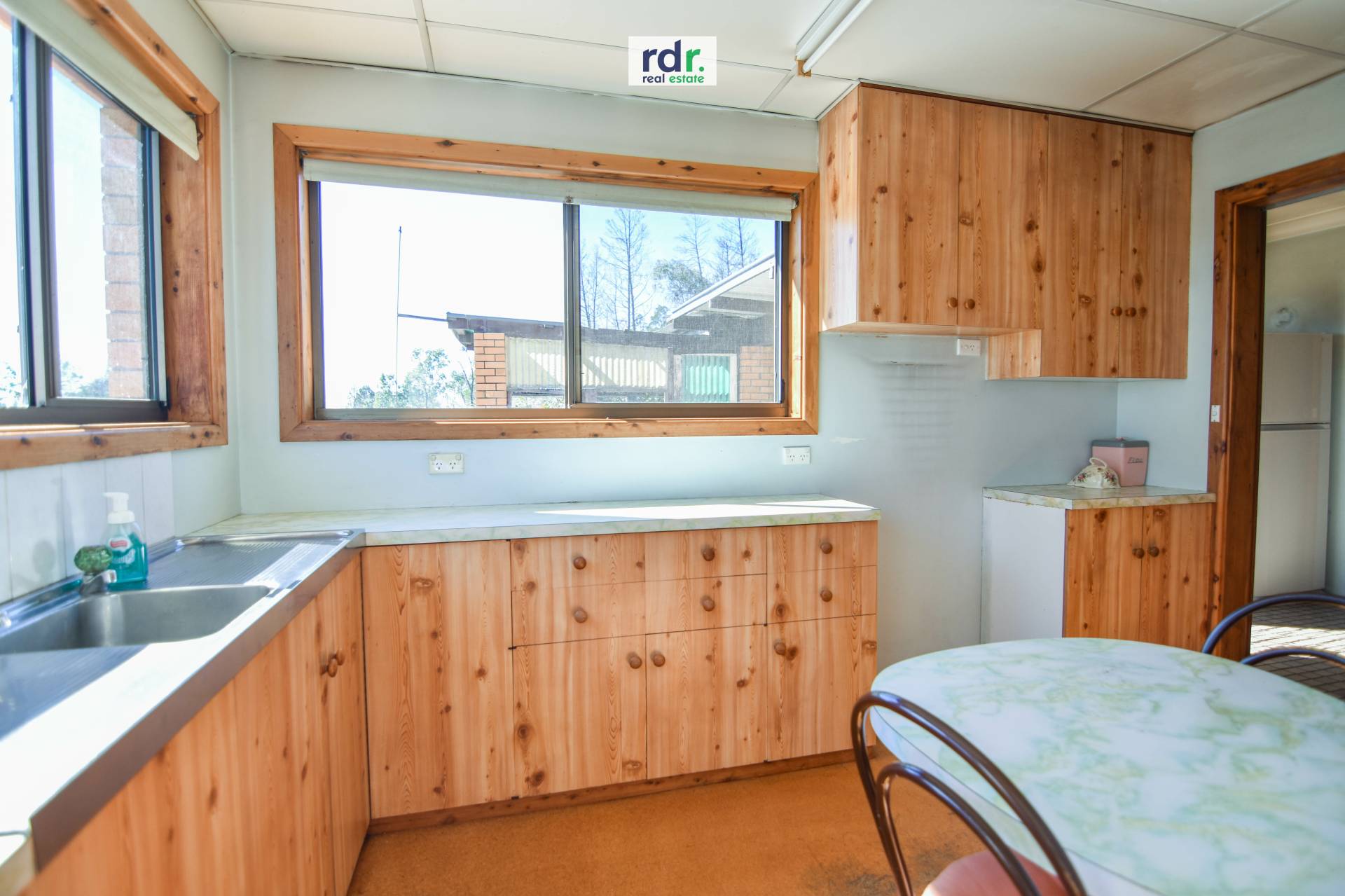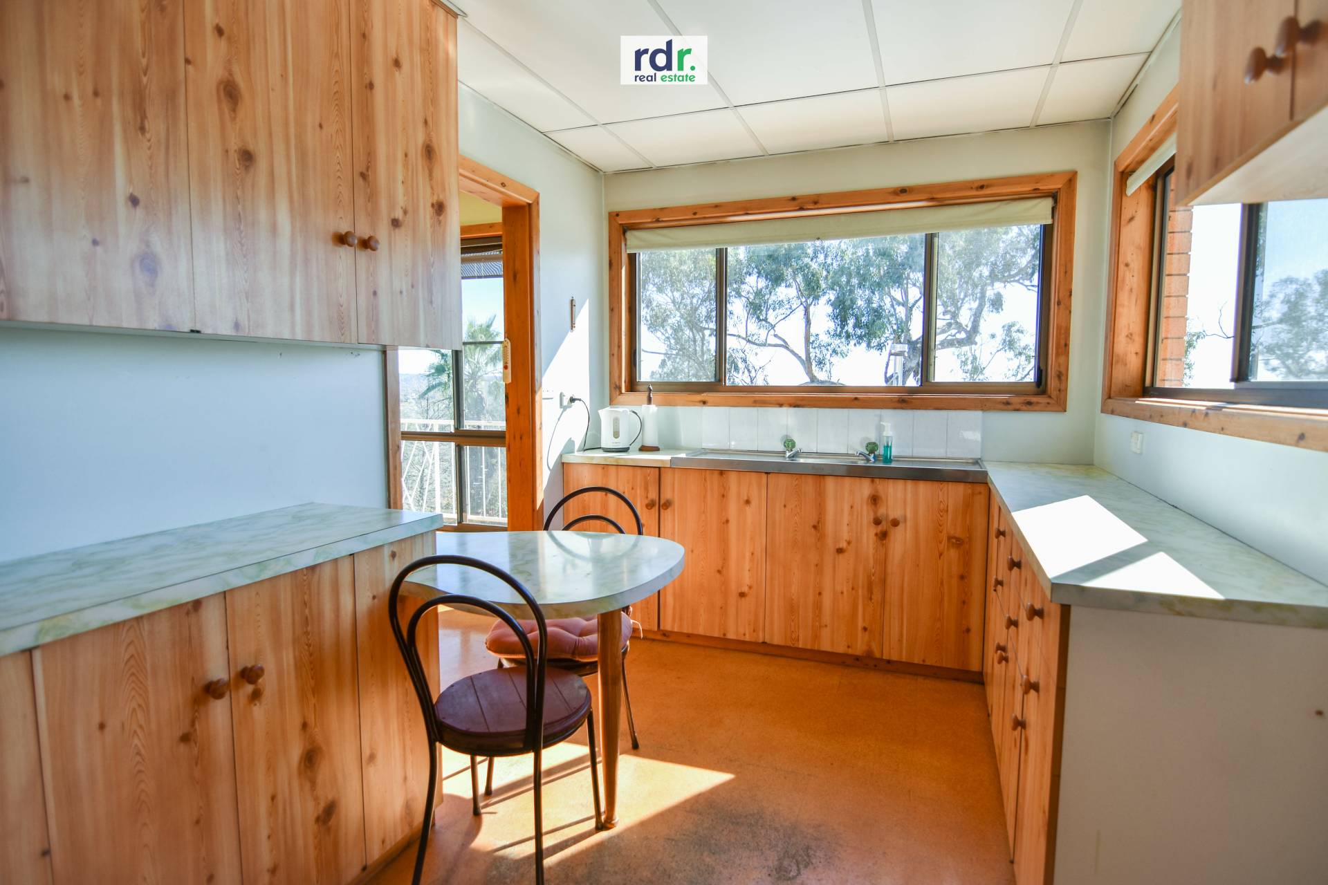 Timber kitchen contains breakfast bar, ample storage and functional preparation space.
