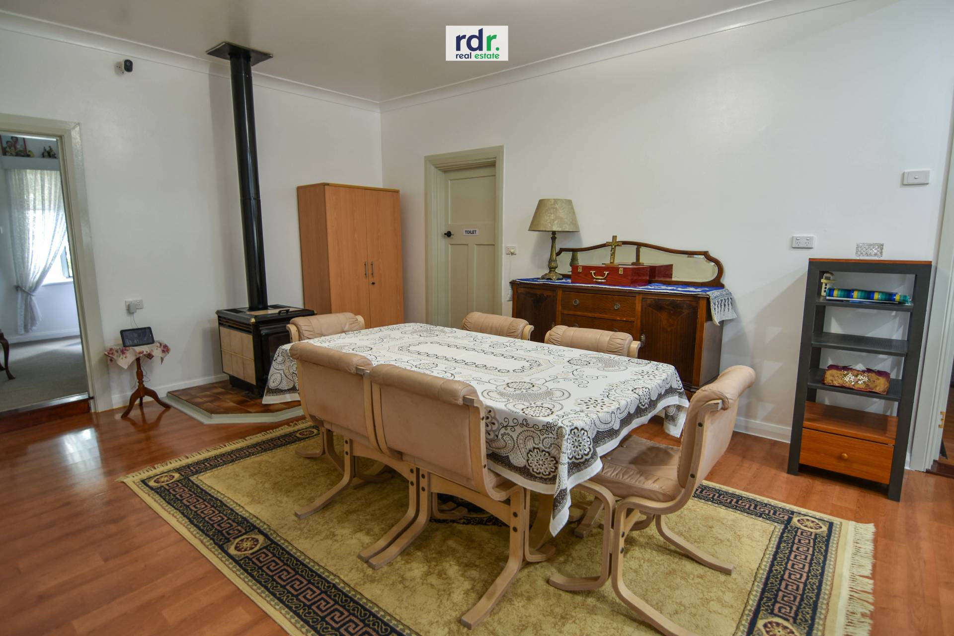 Combining original features with a modern renovation, this kitchen and dining room is warmed by wood heater and is fitted with dishwasher, electric appliances, good storage and island bench.
