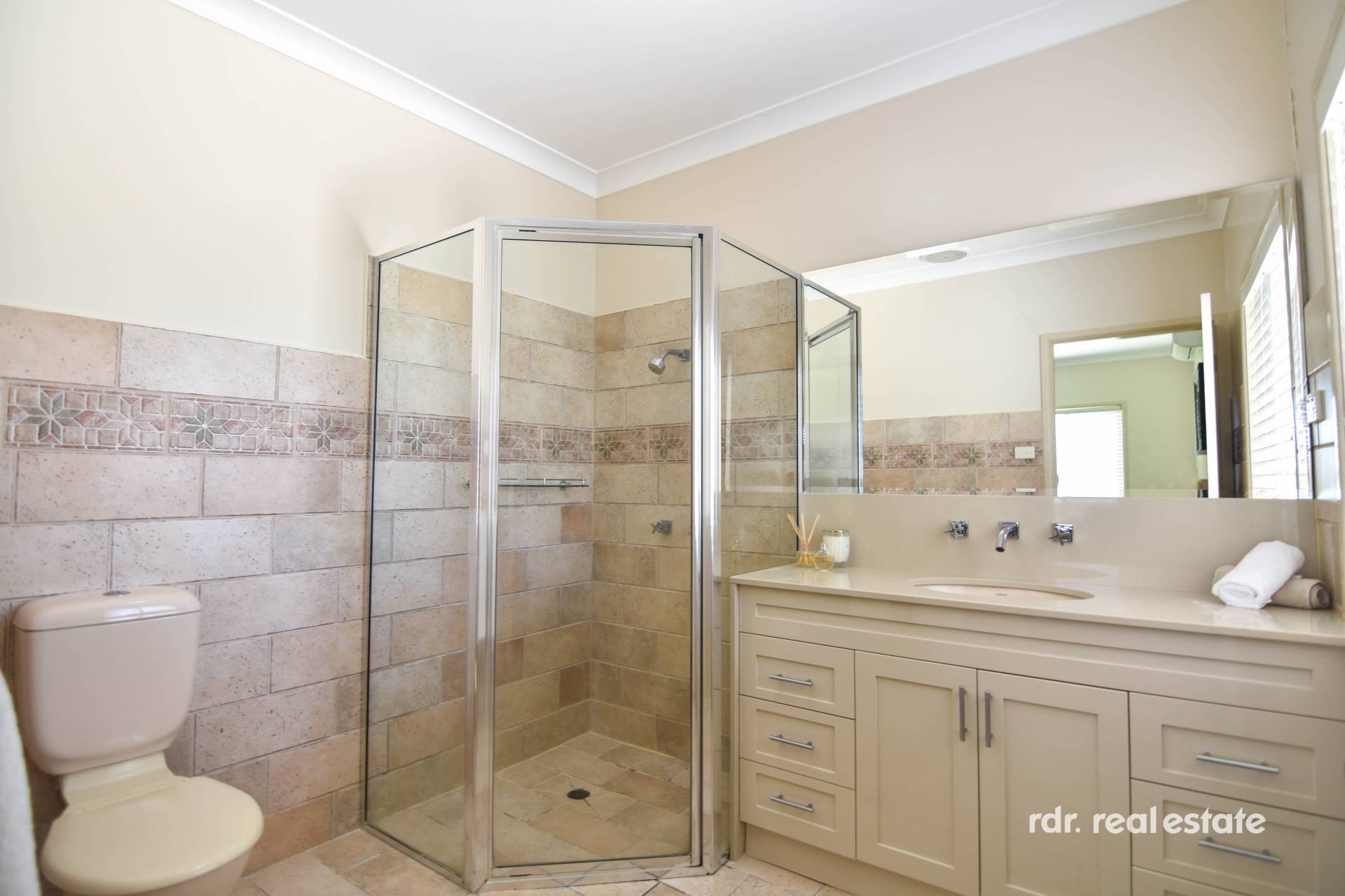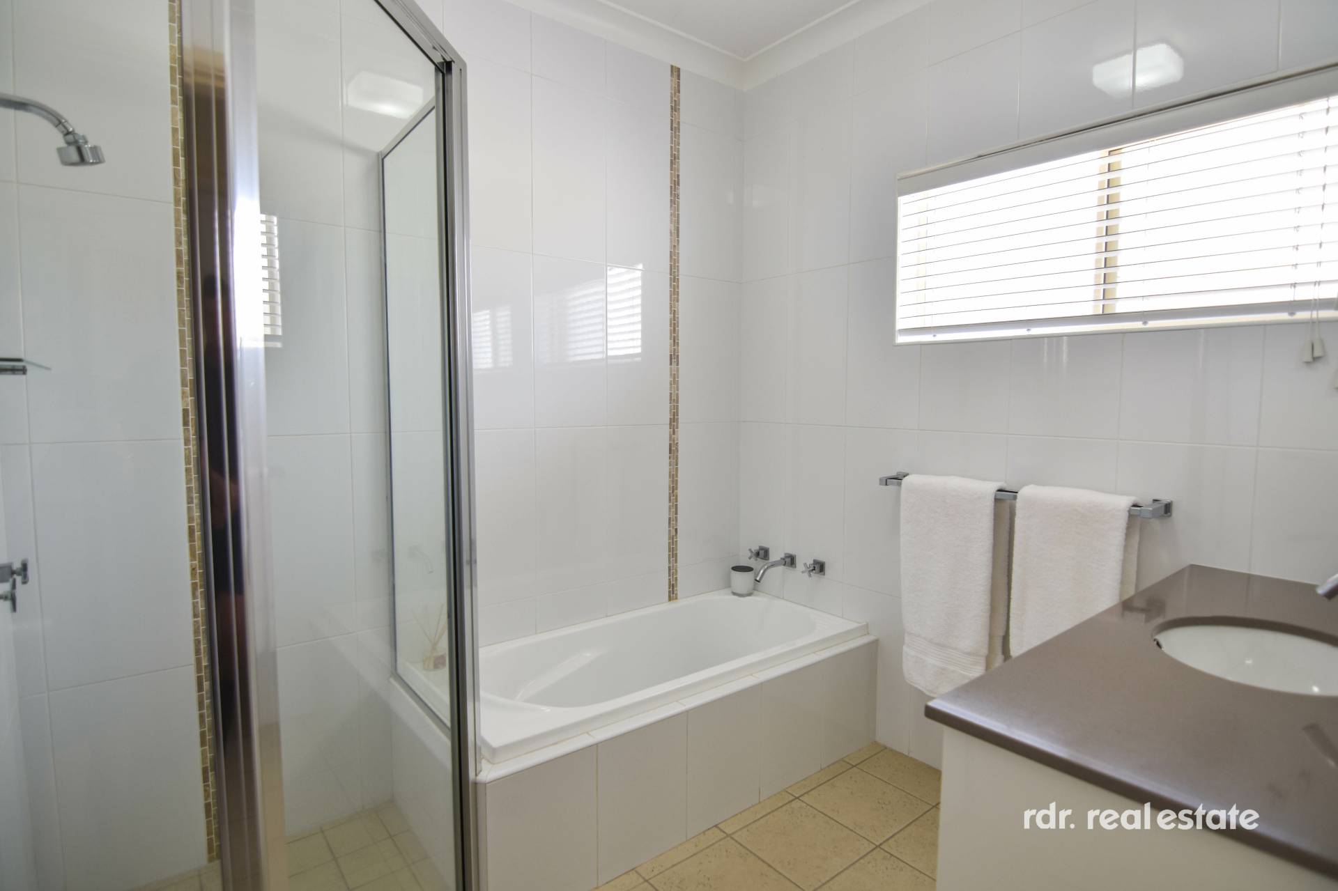 Tiled main bathroom is central to all bedrooms, and comprises of floor-to-ceiling tiles, shower, bathtub, vanity and separate toilet.