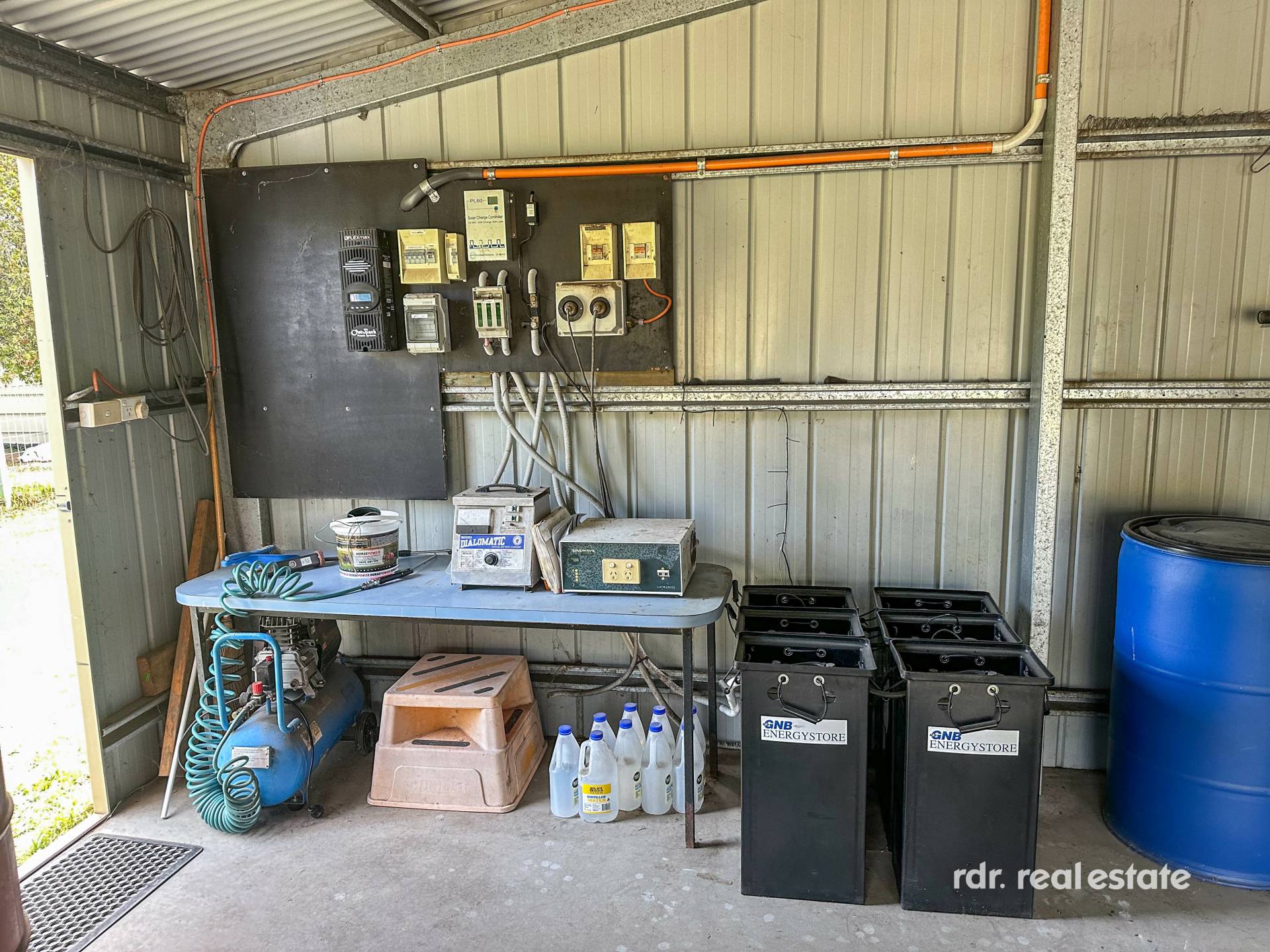 2 bay car garage with concrete floor houses the off-grid solar system. Other improvements include a 2 bay tractor shed, and a small, rustic shearing shed with yards.