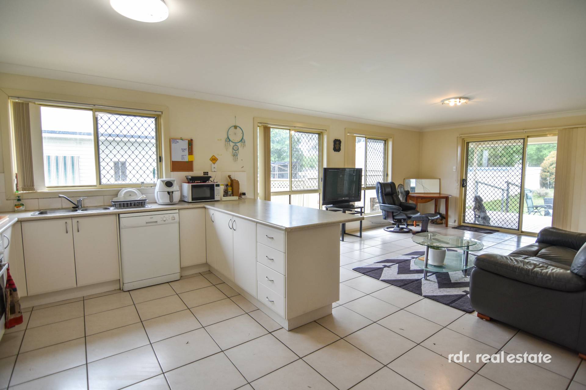 Once inside, you are welcomed into the light-filled and comfortable lounge room. Continuing through, you reach the generous kitchen and dining area with reverse cycle air conditioning for year round comfort. Designed for both casual meals and family dinners, this kitchen is fitted with ample bench space, good storage, breakfast, bar, dishwasher, and electric cooking.