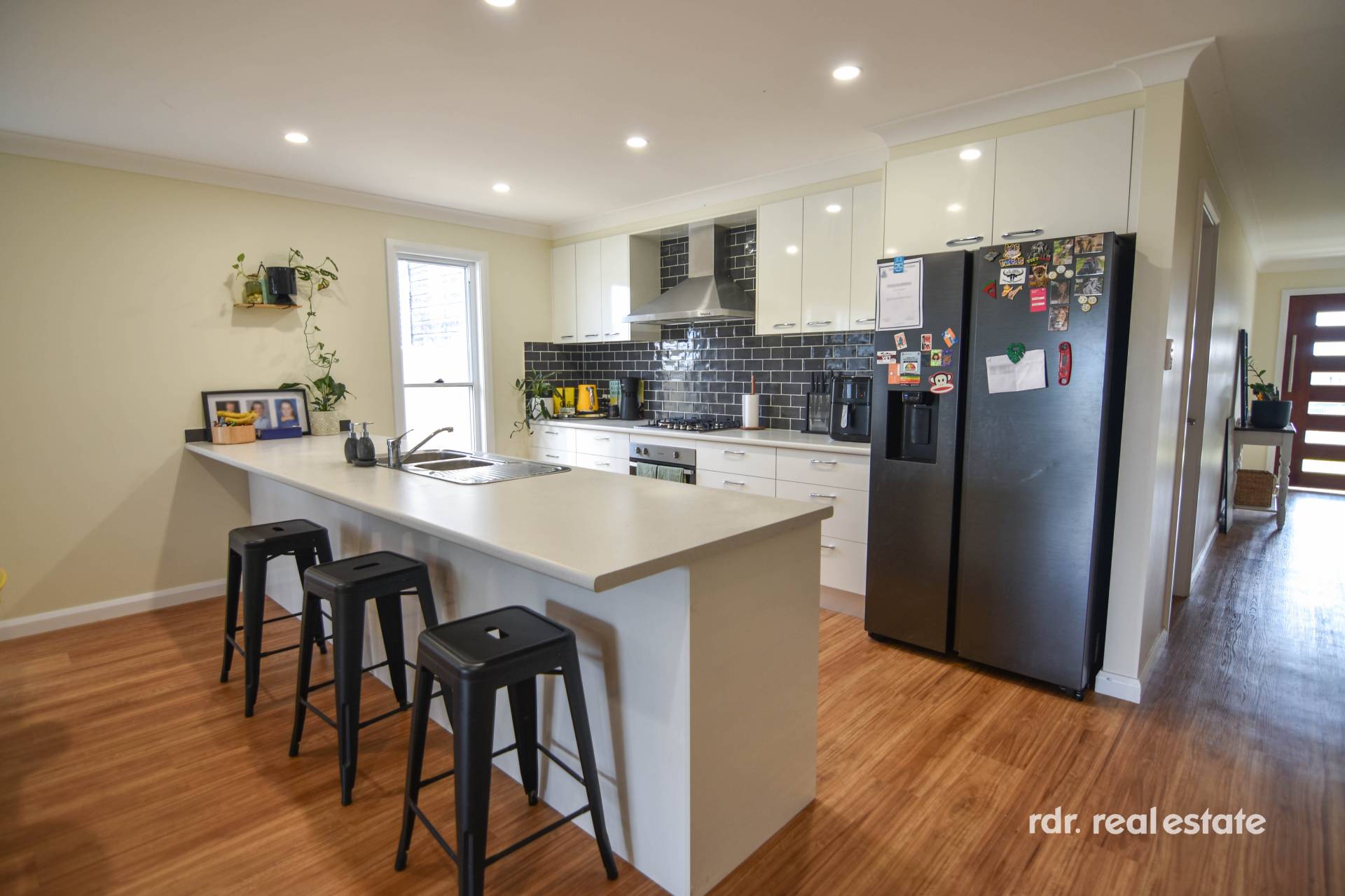 This sunny, open plan lounge, dining and kitchen area allows for harmonious family living. For winter warmth and summer cooling, there is the reverse cycle air conditioner and gas bayonet. This stylish kitchen overlooks your living and meals area and is fitted with quality appliances, ample cupboards and breakfast bar, so the whole family can help prepare dinner together and catch up on the day.
