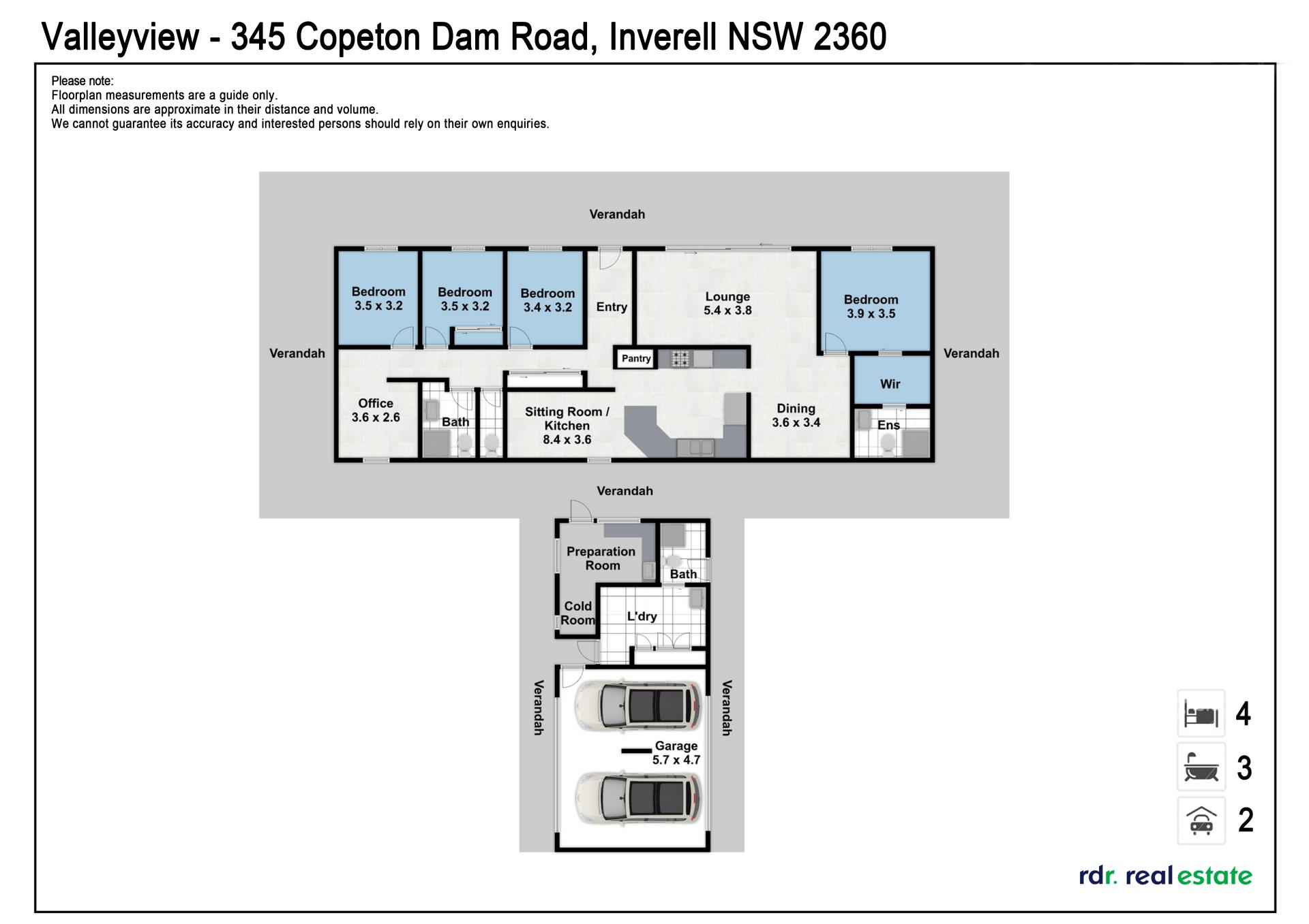 Breezeway connects the main home to the double drive-through garage with electric roller doors, laundry, bathroom, and preparation and cool room.