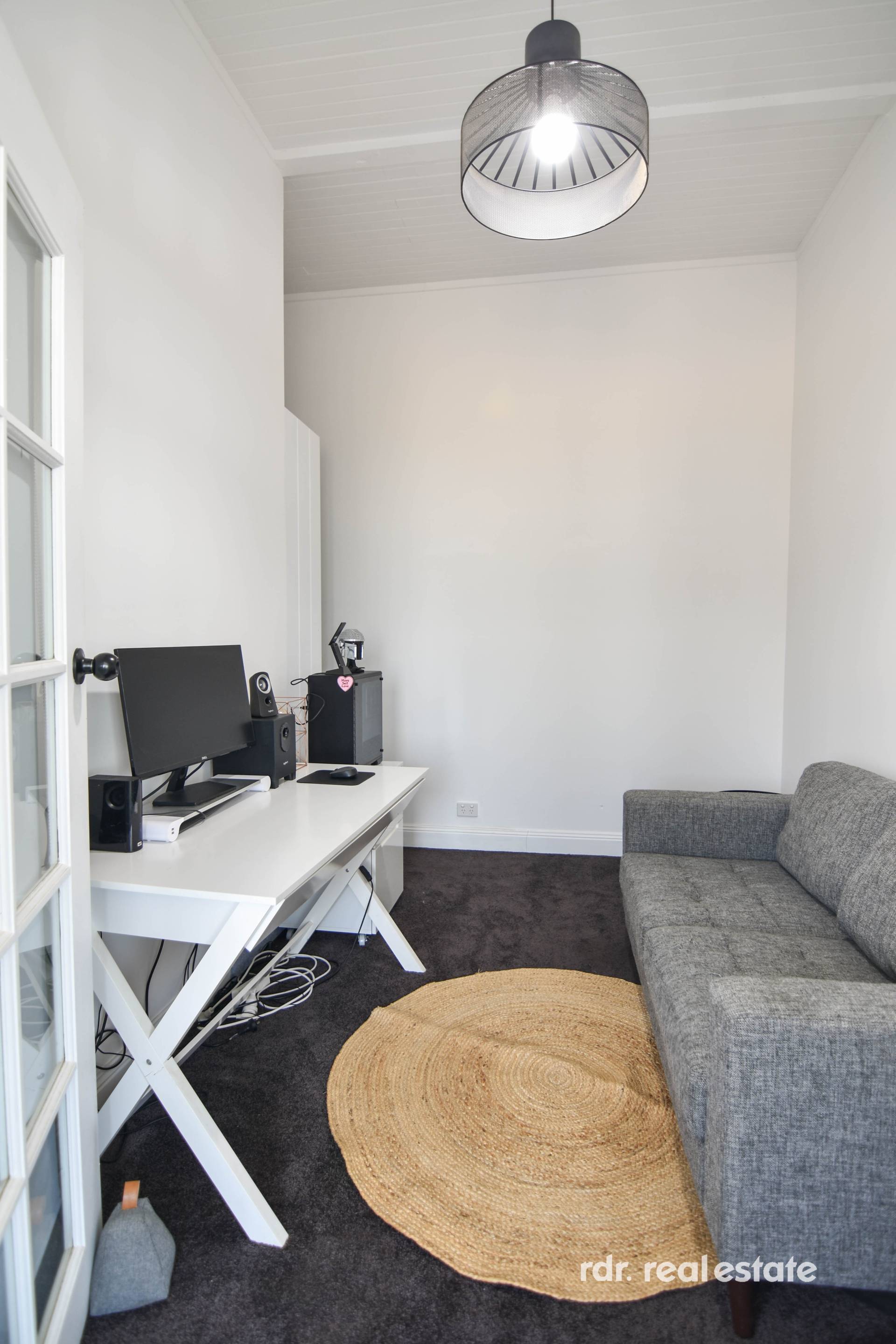 A sun-filled L-shaped sunroom or home office opens seamlessly onto a lovely timber deck — the perfect place to relax and enjoy the sunshine.