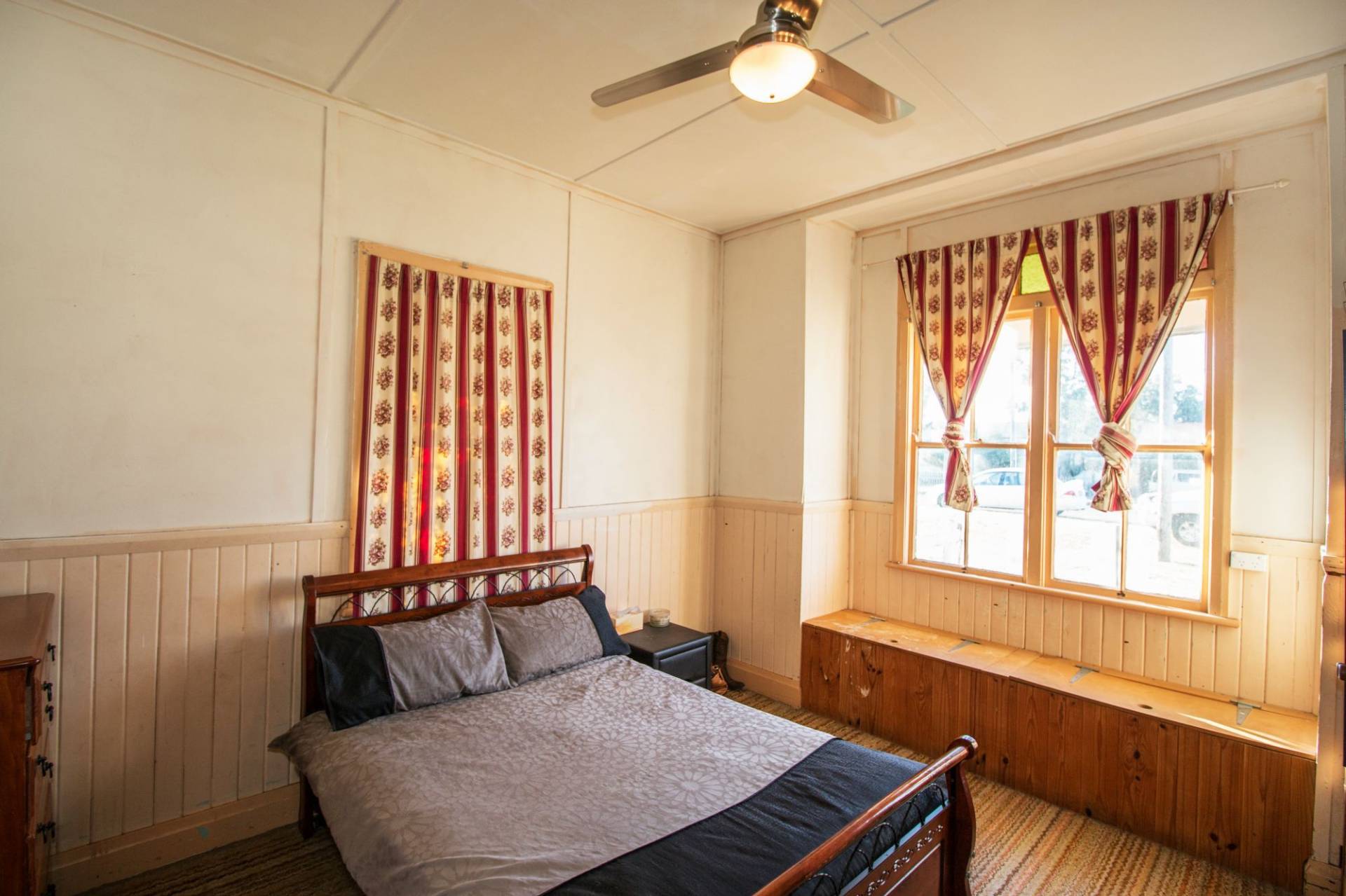 Main bedroom with window seat, built-ins, original timber window with stained glass, fully carpeted.