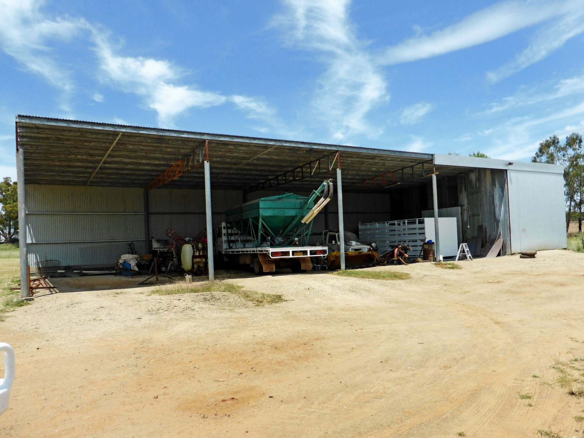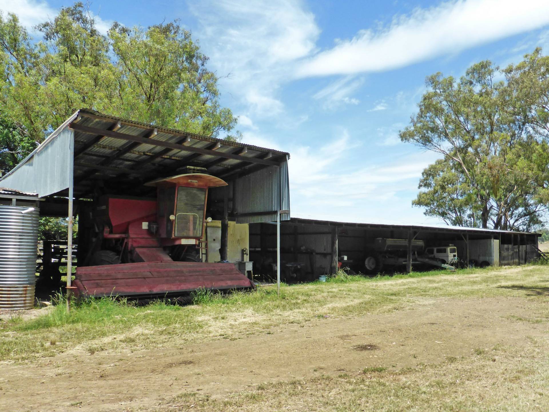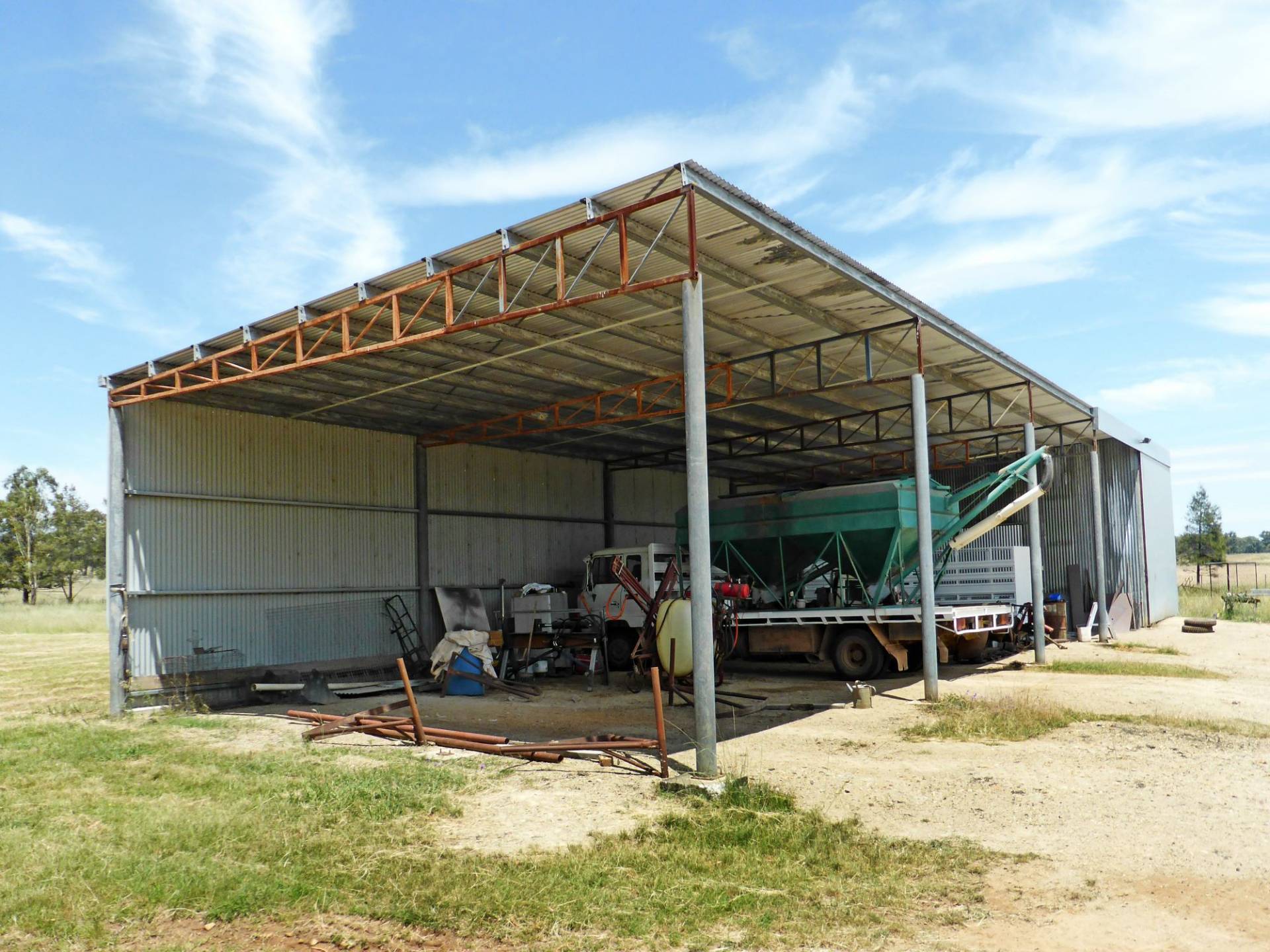 MACHINERY SHED: Steel frame, 29m x 8m, 5 bay including 1 bay fully enclosed with concrete floor and power. Header shed plus 4 bay shed all enclosed on 3 sides with cool room plus 2 stables.