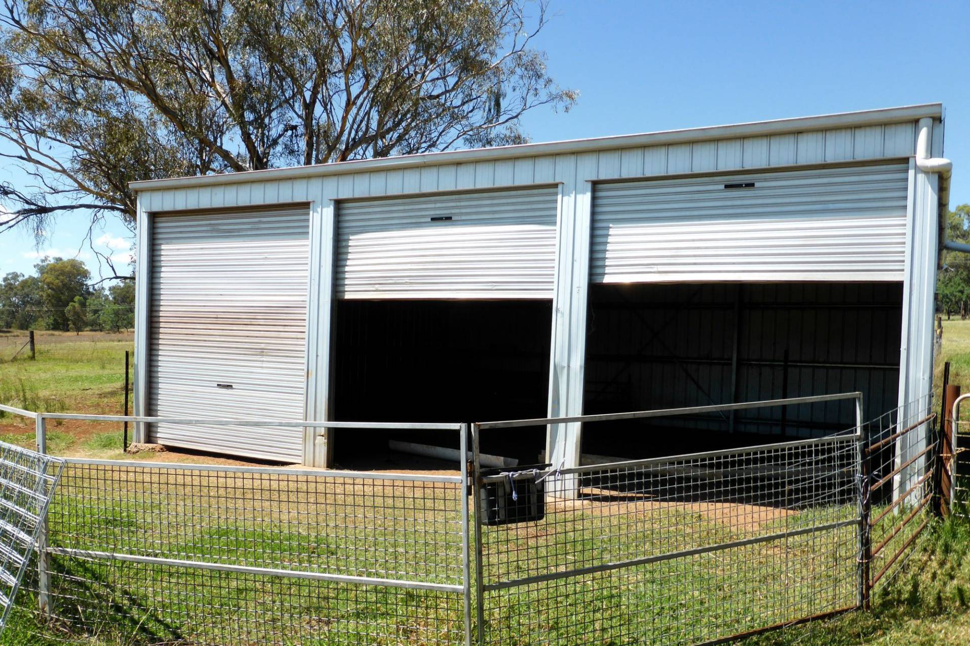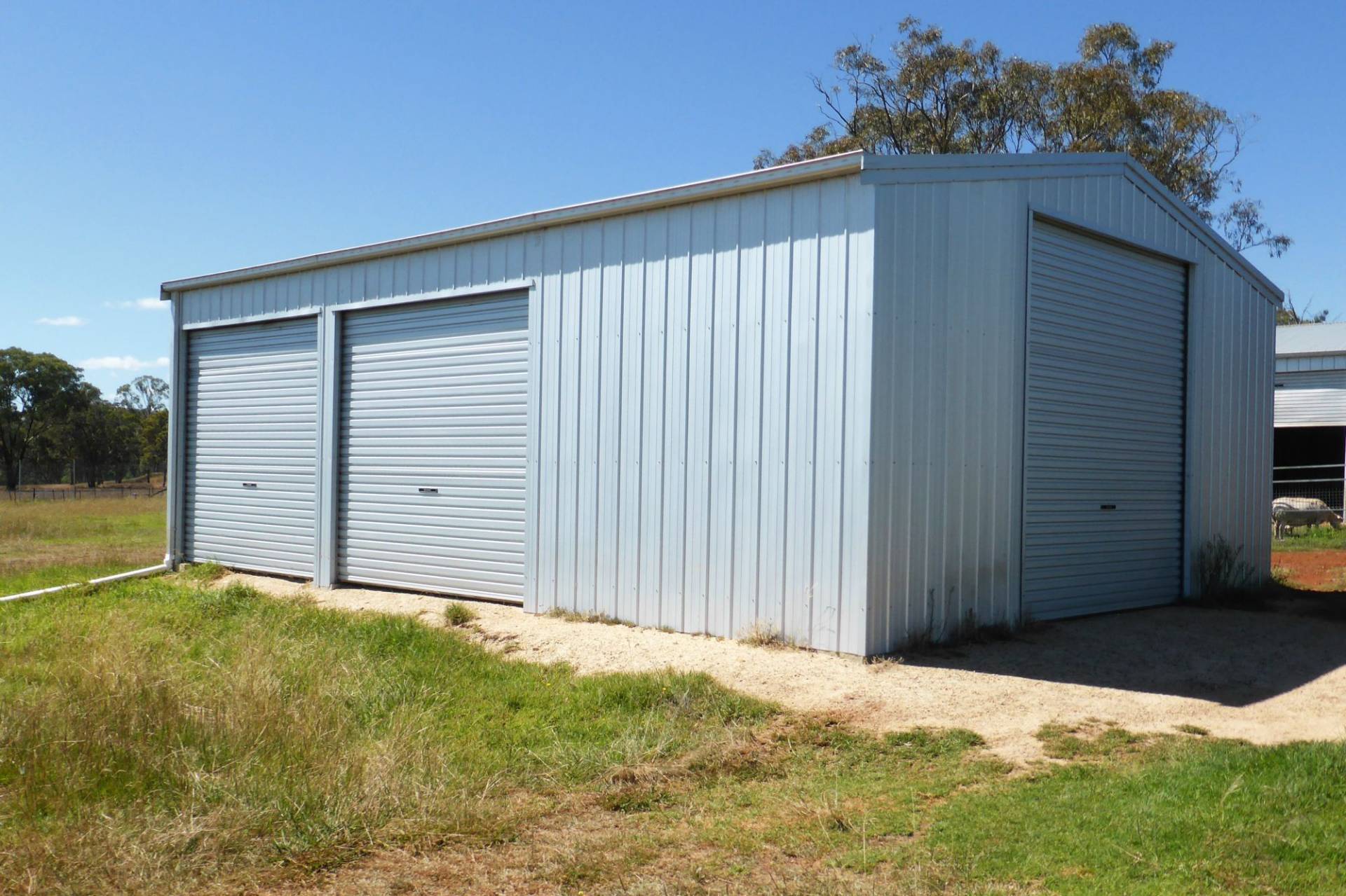 Steel frame lock-up shed 8m x 6m. 3 roller doors and private access door. 22,730Ltr tank.