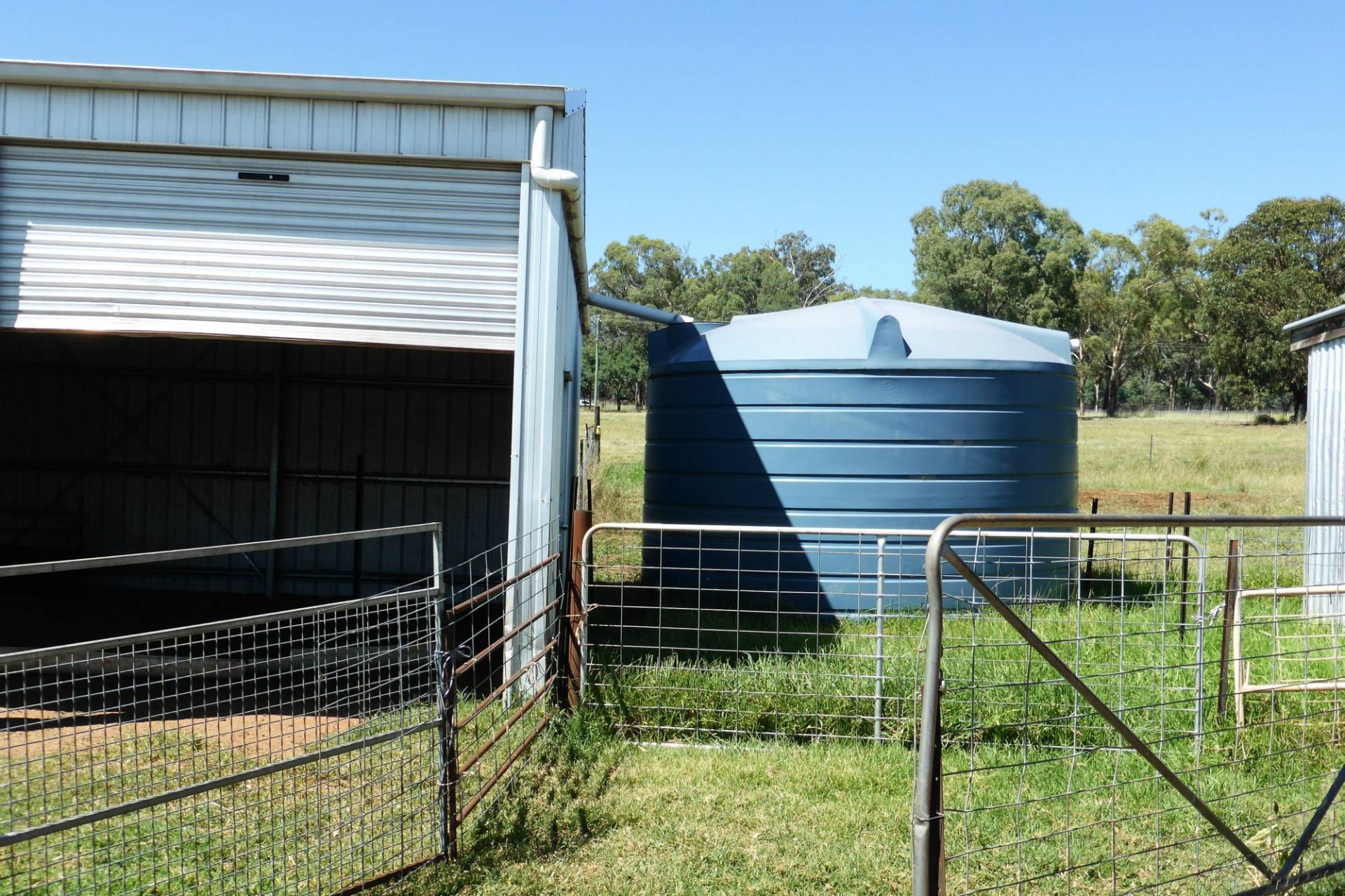 Steel frame shed 10m x 9m enclosed on 3 sides with concrete floor Powered Workshop. 22,730Ltr concrete tank, connected back to tank at residence.