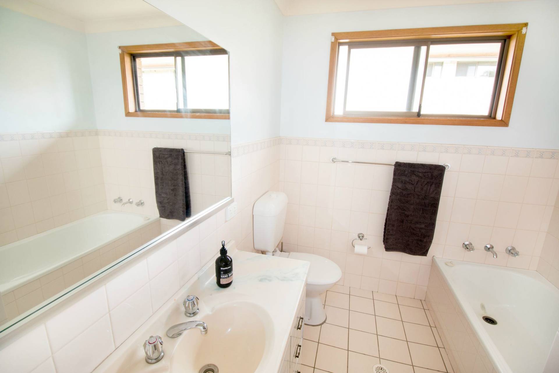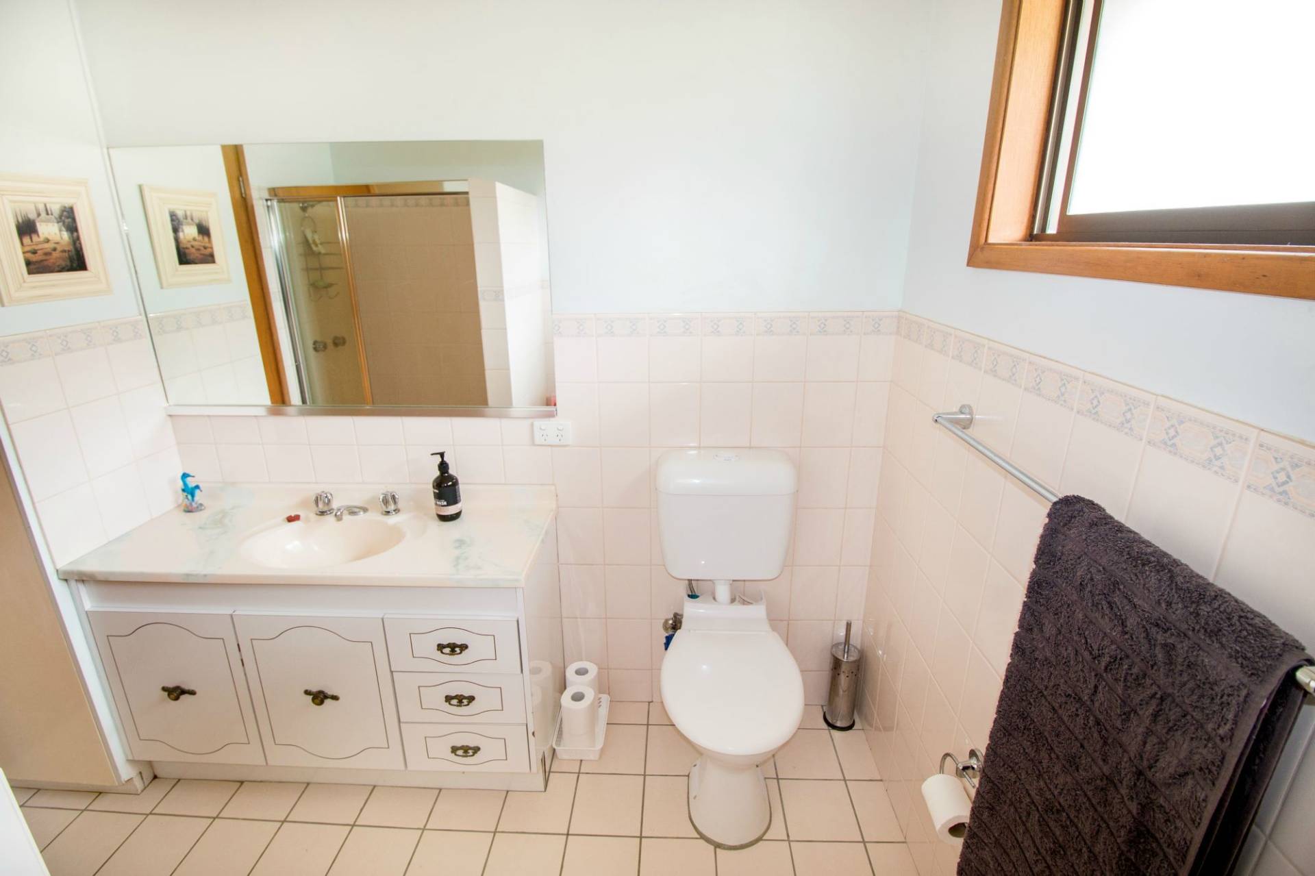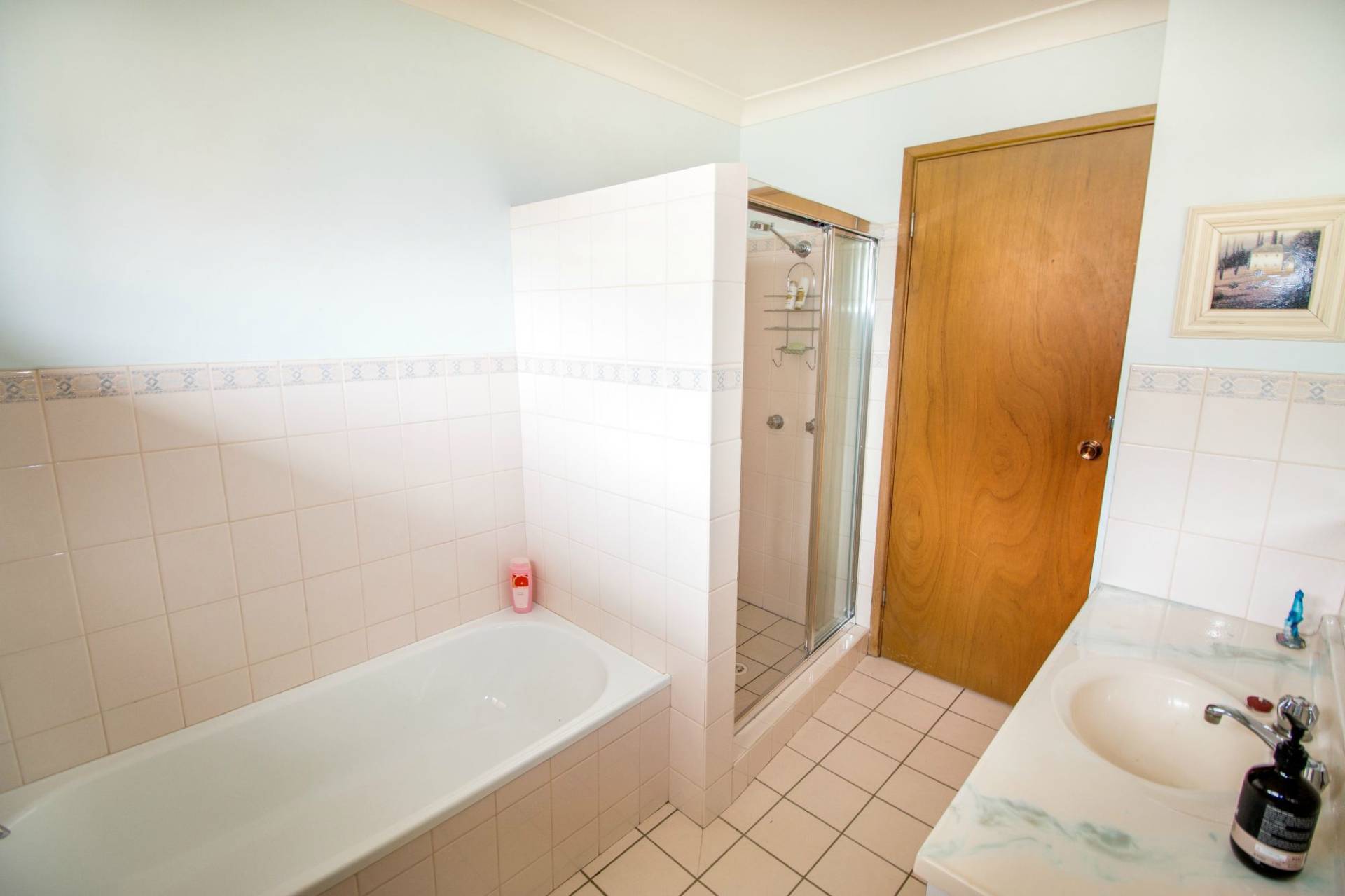 * Tiled main bathroom with separate shower, built-in bath tub, single vanity, built-in linen cupboard, toilet.