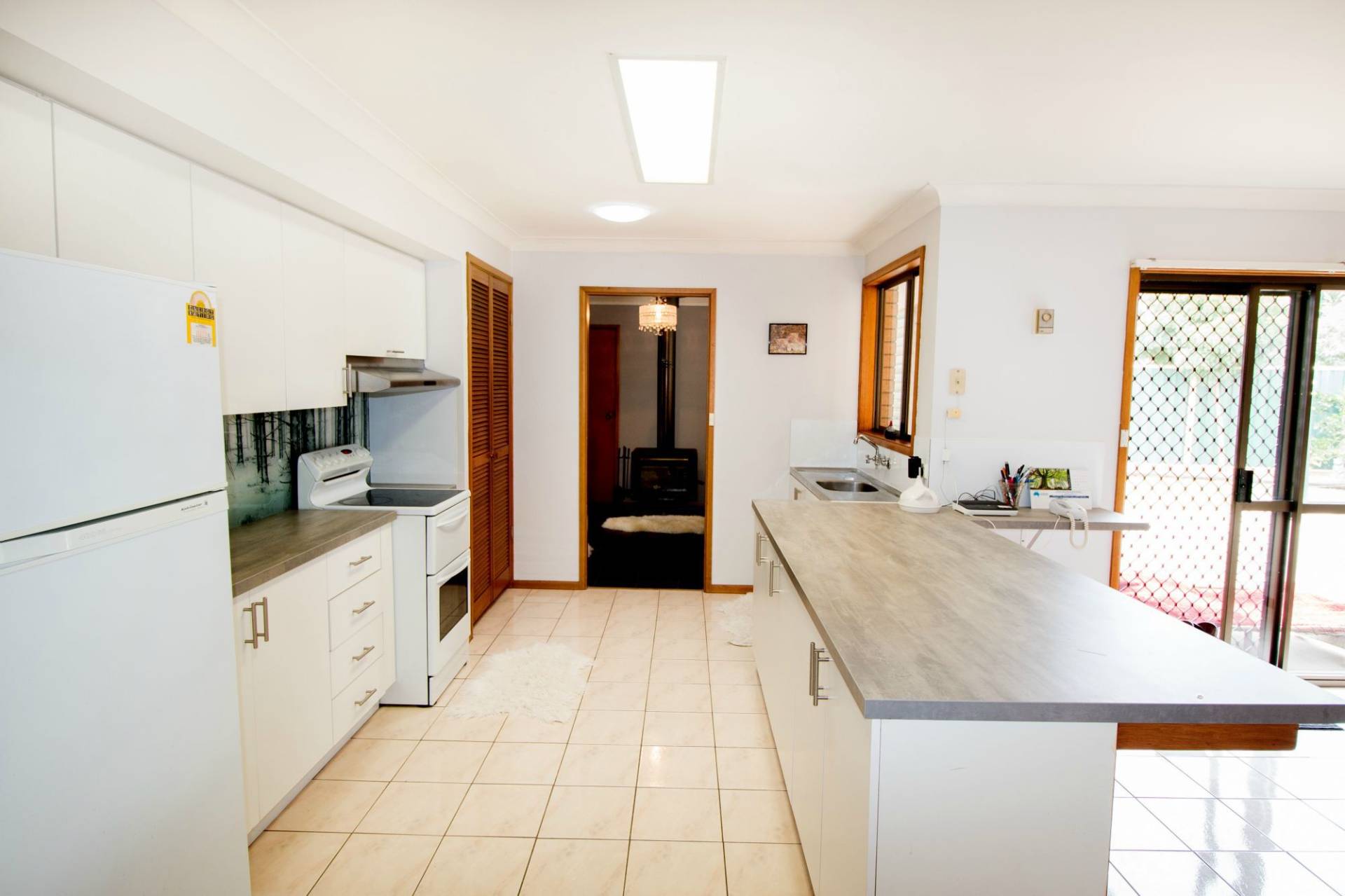 * Tiled open plan kitchen/ dining space. Recently updated kitchen offering: large breakfast bench, 2 door pantry cupboard, feature splash back, free standing Westinghouse electric oven, single SS sink looking out over the back yard, skylight. Dining room opens out into the back yard through a glass sliding door onto the concreted BBQ area.