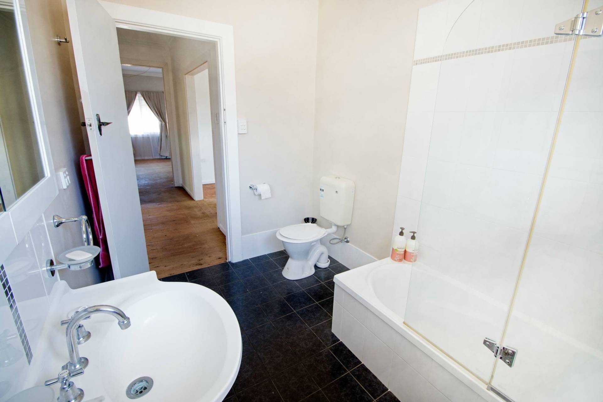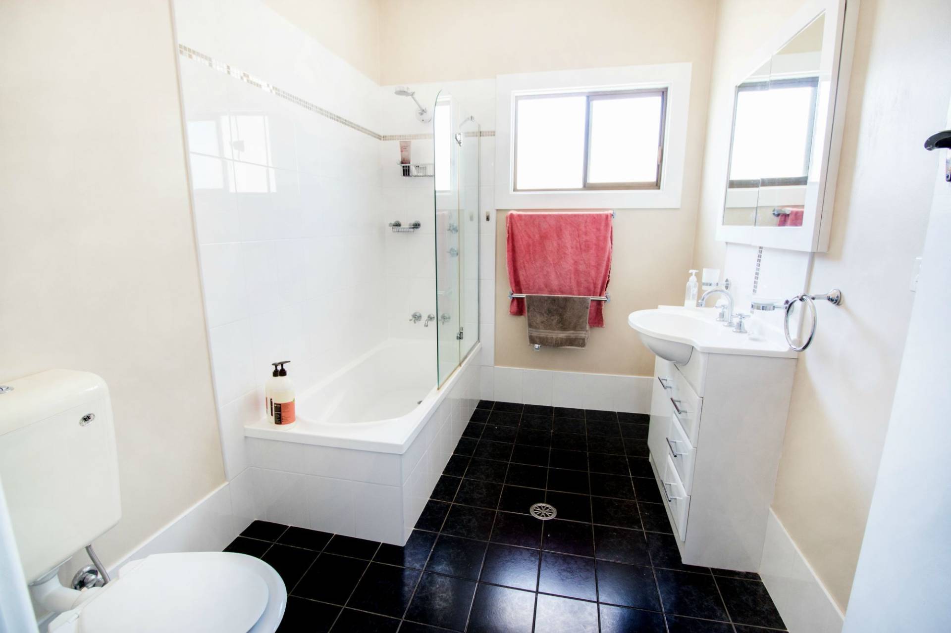 * Recently updated tiled bathroom. Boasting built-in bath tub with overhead shower. Single vanity + wall mirror. Stainless Steel look towel rails, 3 in 1 exhaust/heat/light. Toilet.