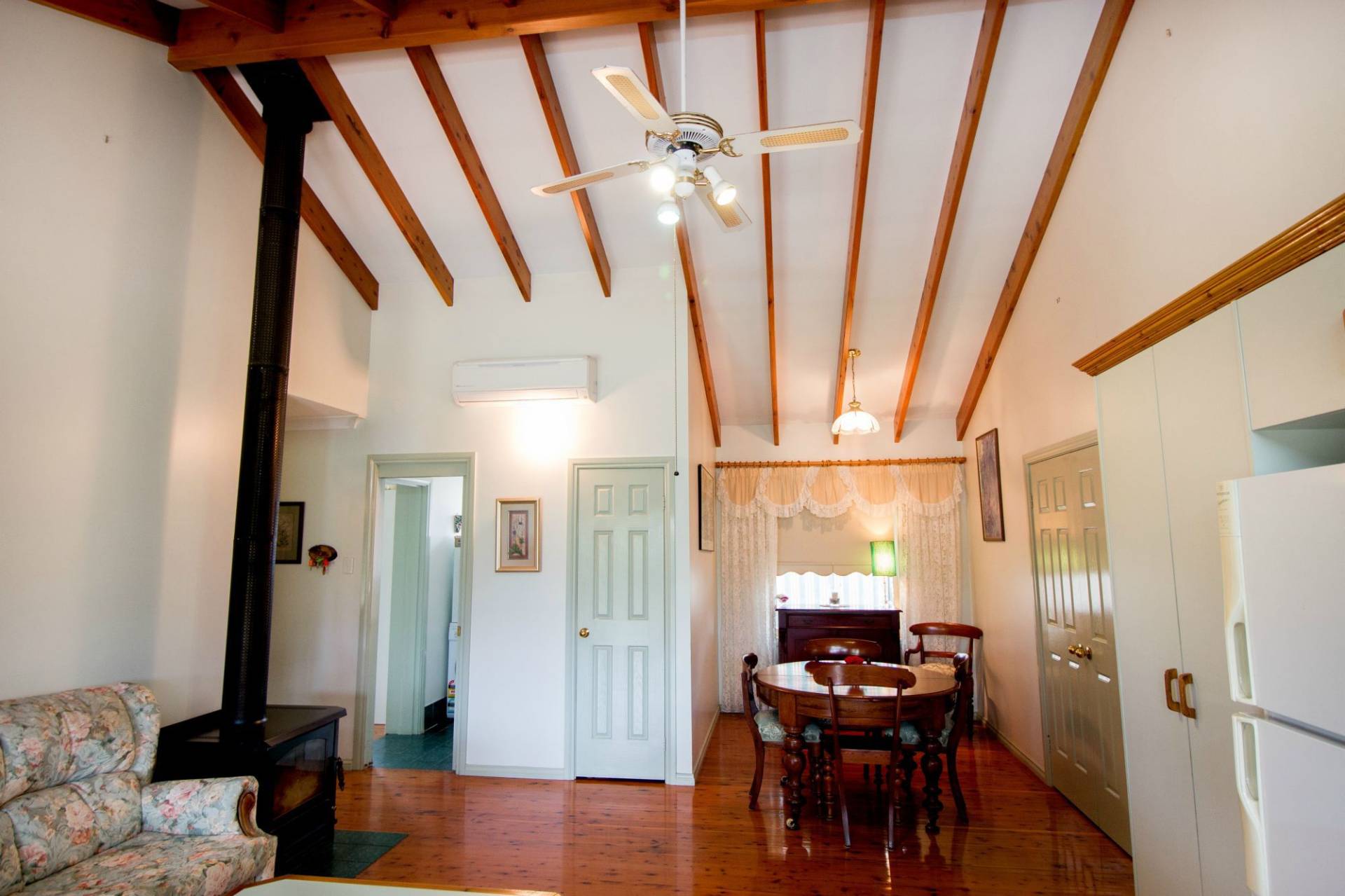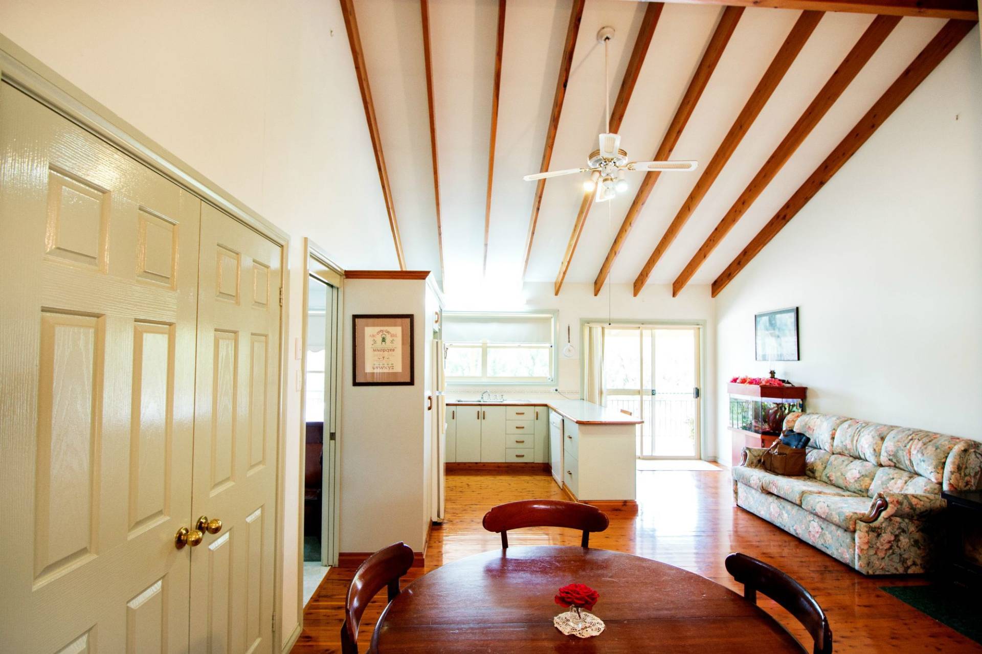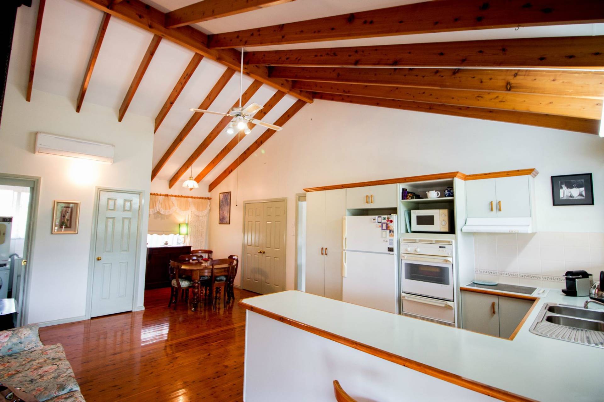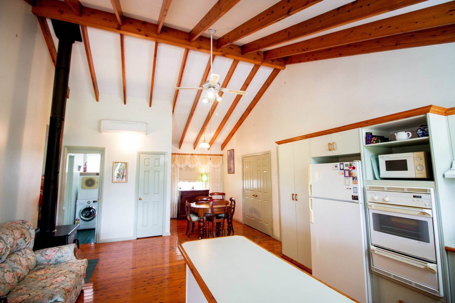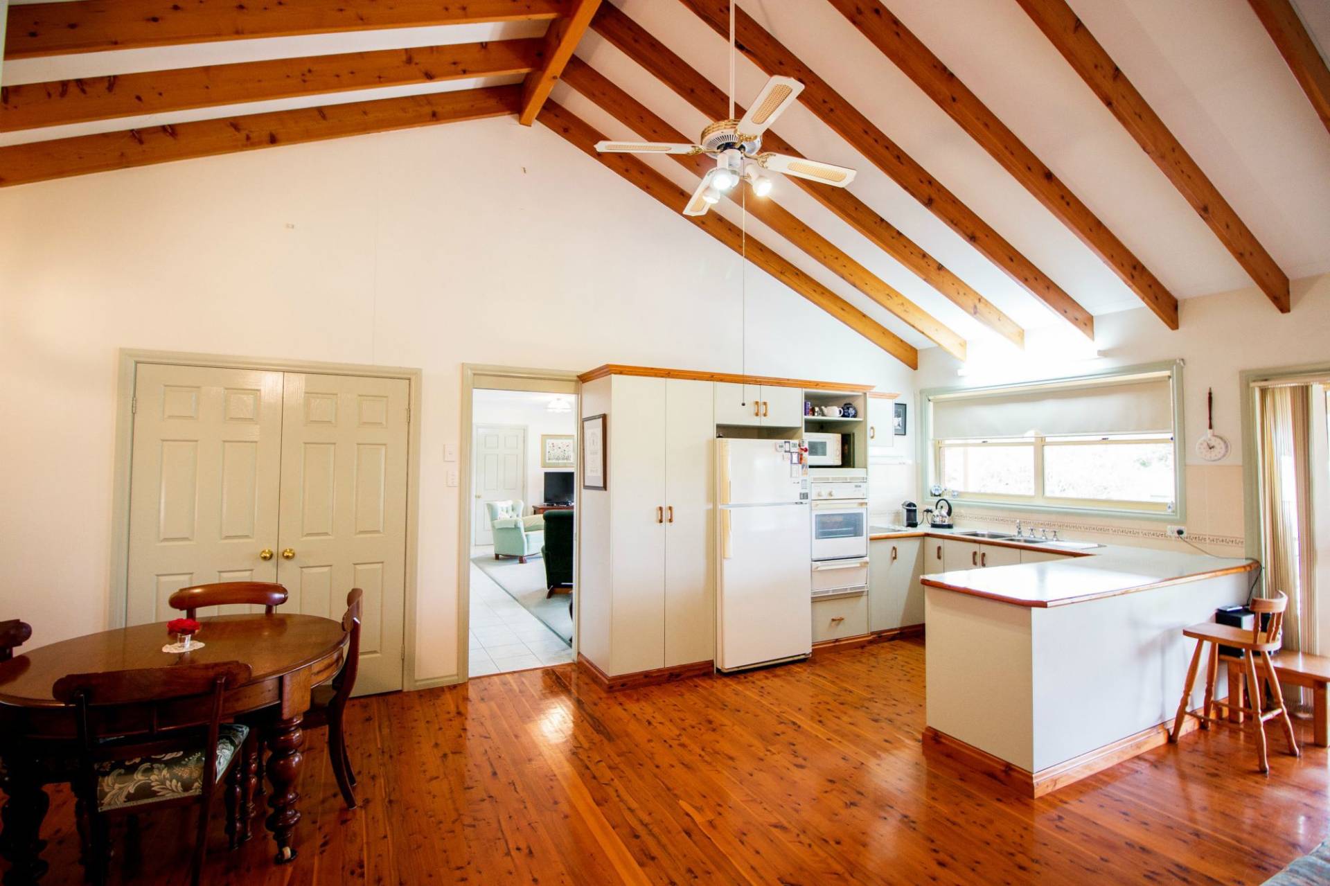 * Open plan kitchen/dining area with polished timber floorboards throughout boasting: pitched ceiling with feature timber beams, wood heater + reverse cycle air conditioning, 2 way fan, large full size - 2 door storage cupboard with shelving. This is a great entertaining/family space.