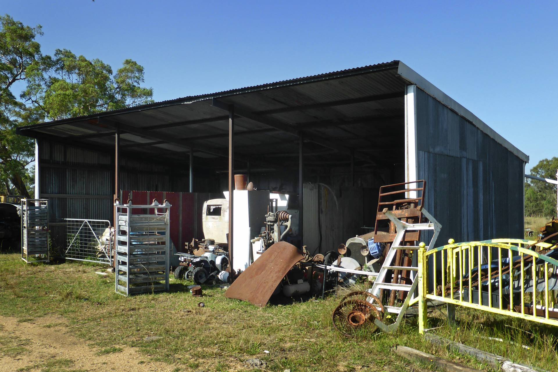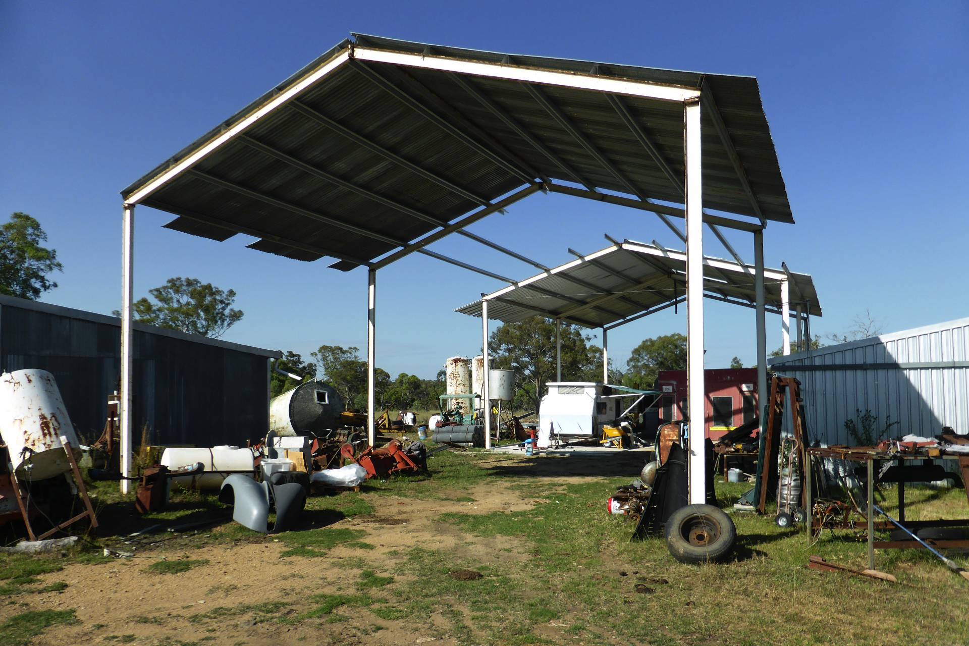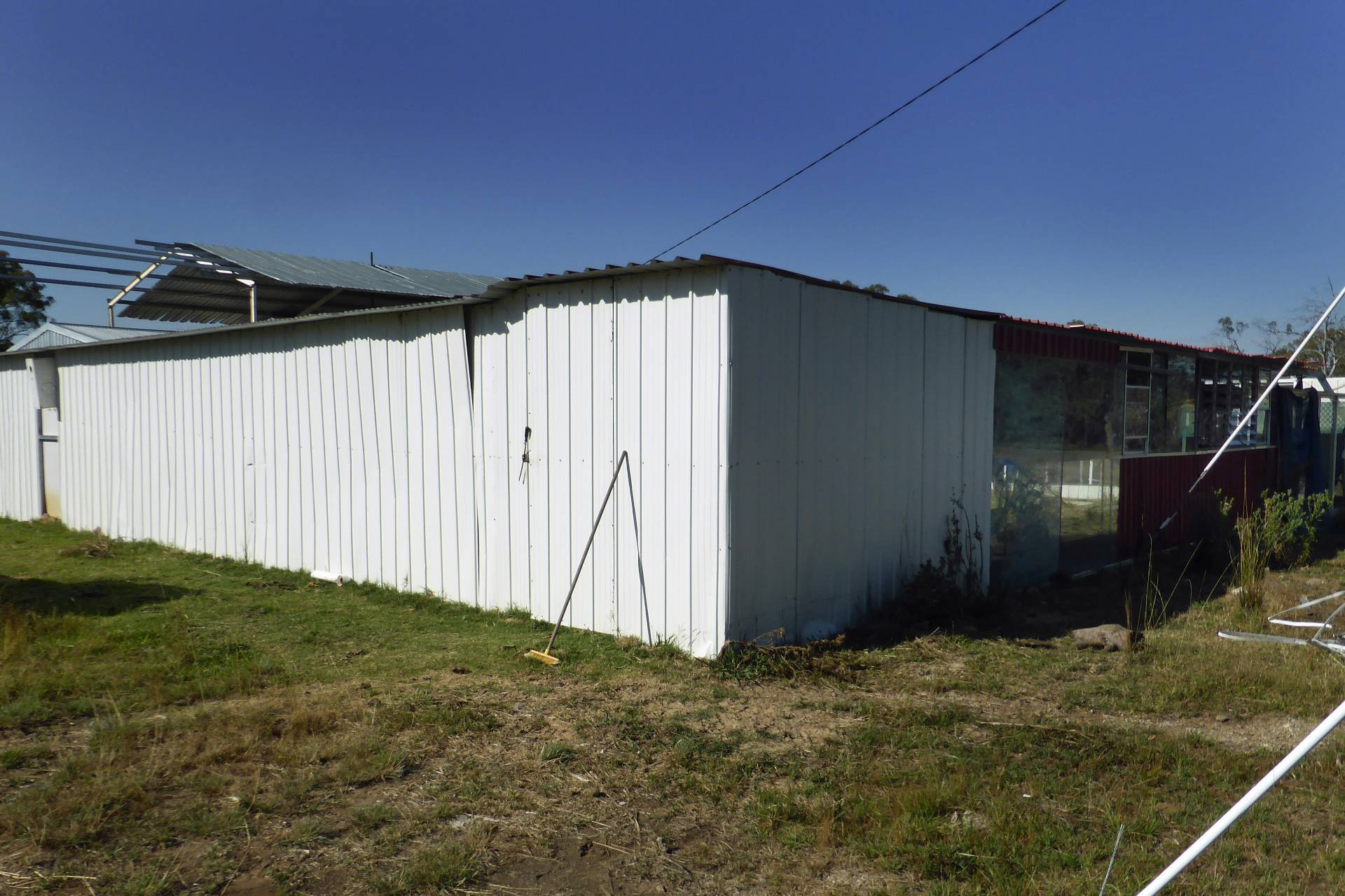 MACHINERY SHED:  30m x 11m roof only. 12mm x 9m enclosed on 3 sides. 12m x 8m.