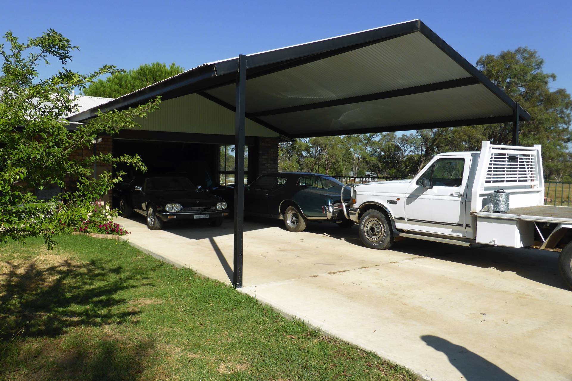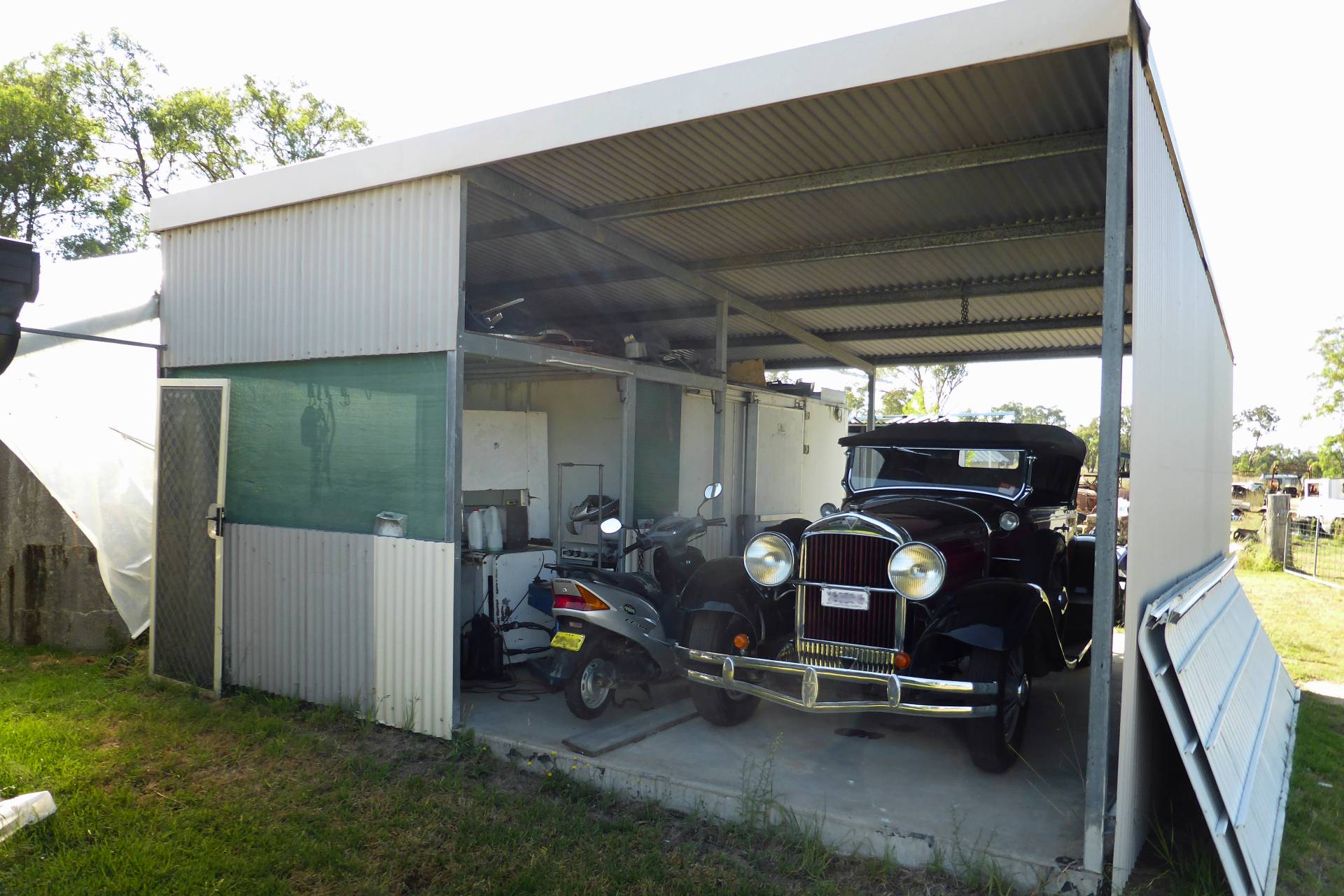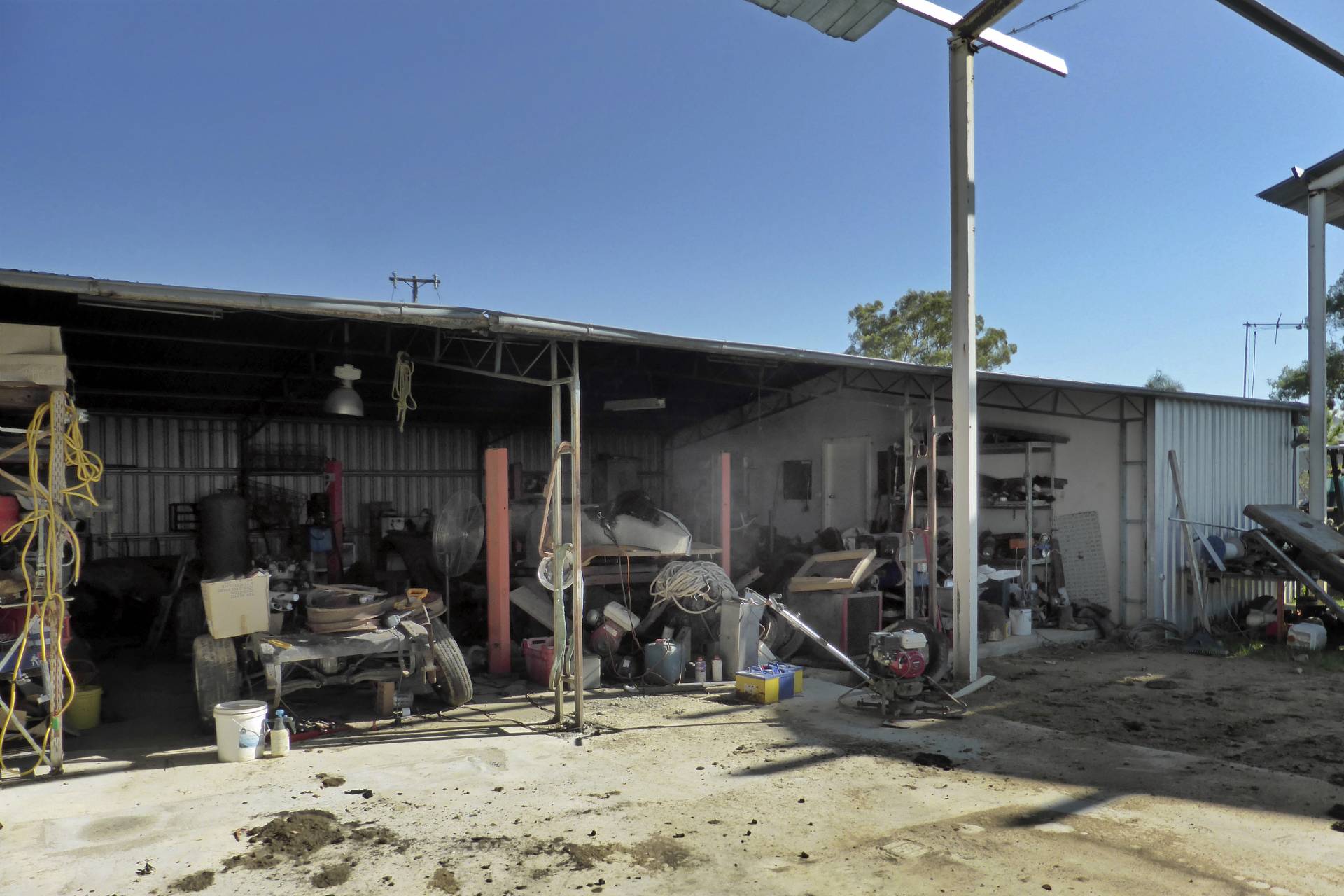 MACHINERY SHED:  30m x 11m roof only. 12mm x 9m enclosed on 3 sides. 12m x 8m.