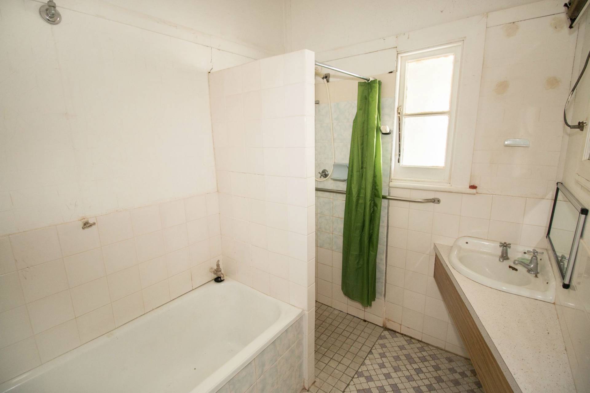 Basic tiled bathroom with bathtub, separate shower and single vanity - Linen cupboard.