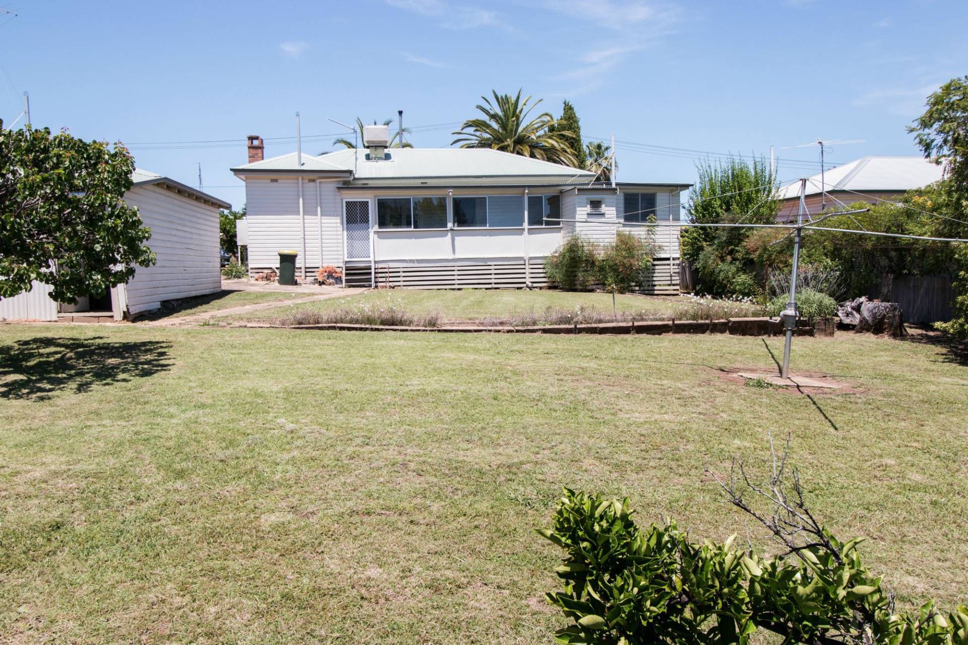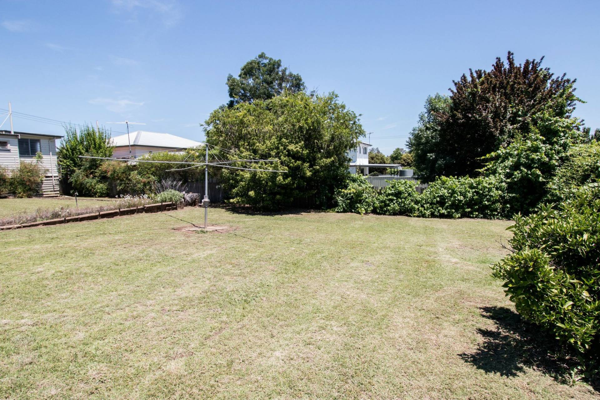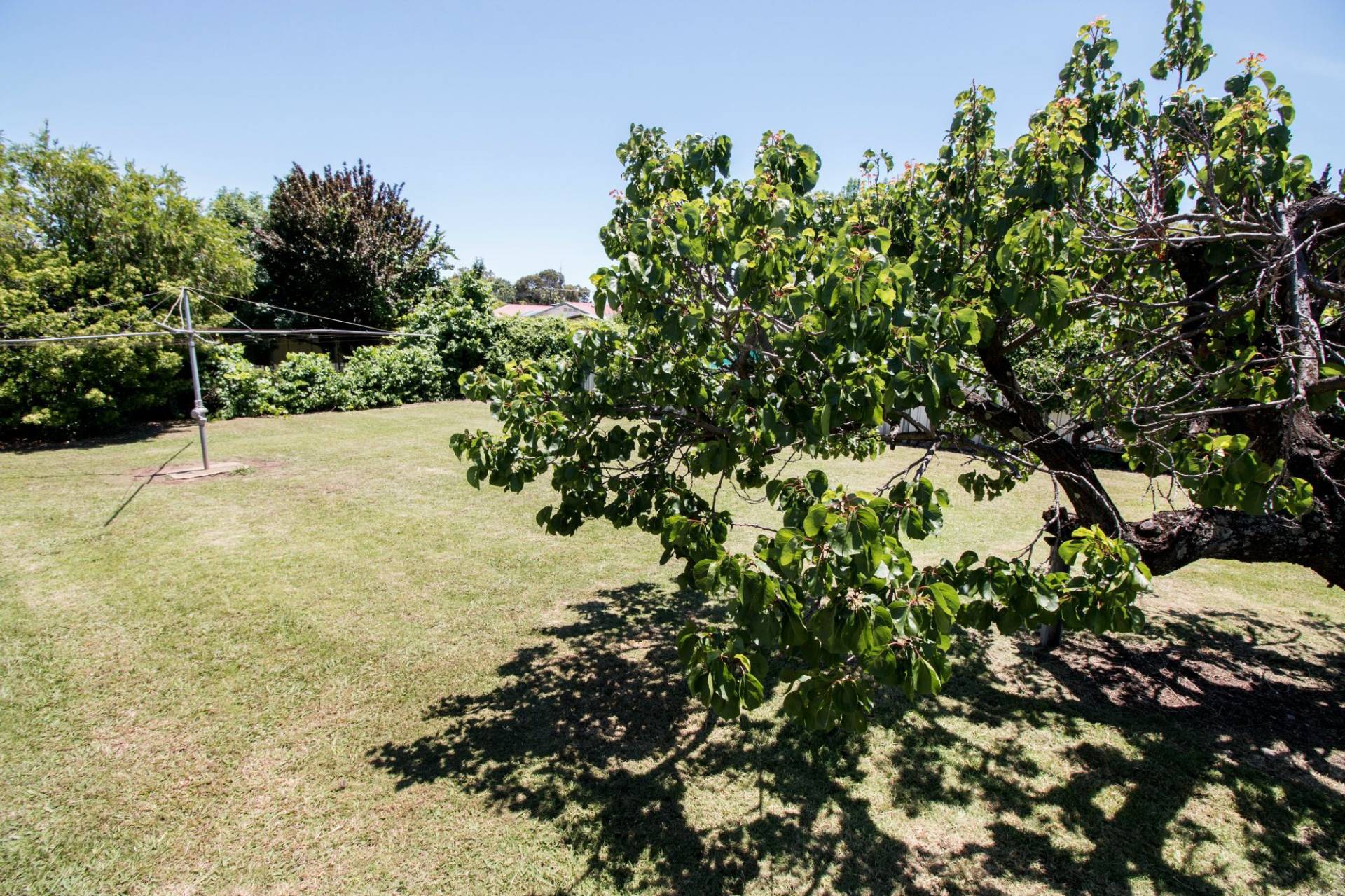 Hills hoist clothes line. Fruit trees.