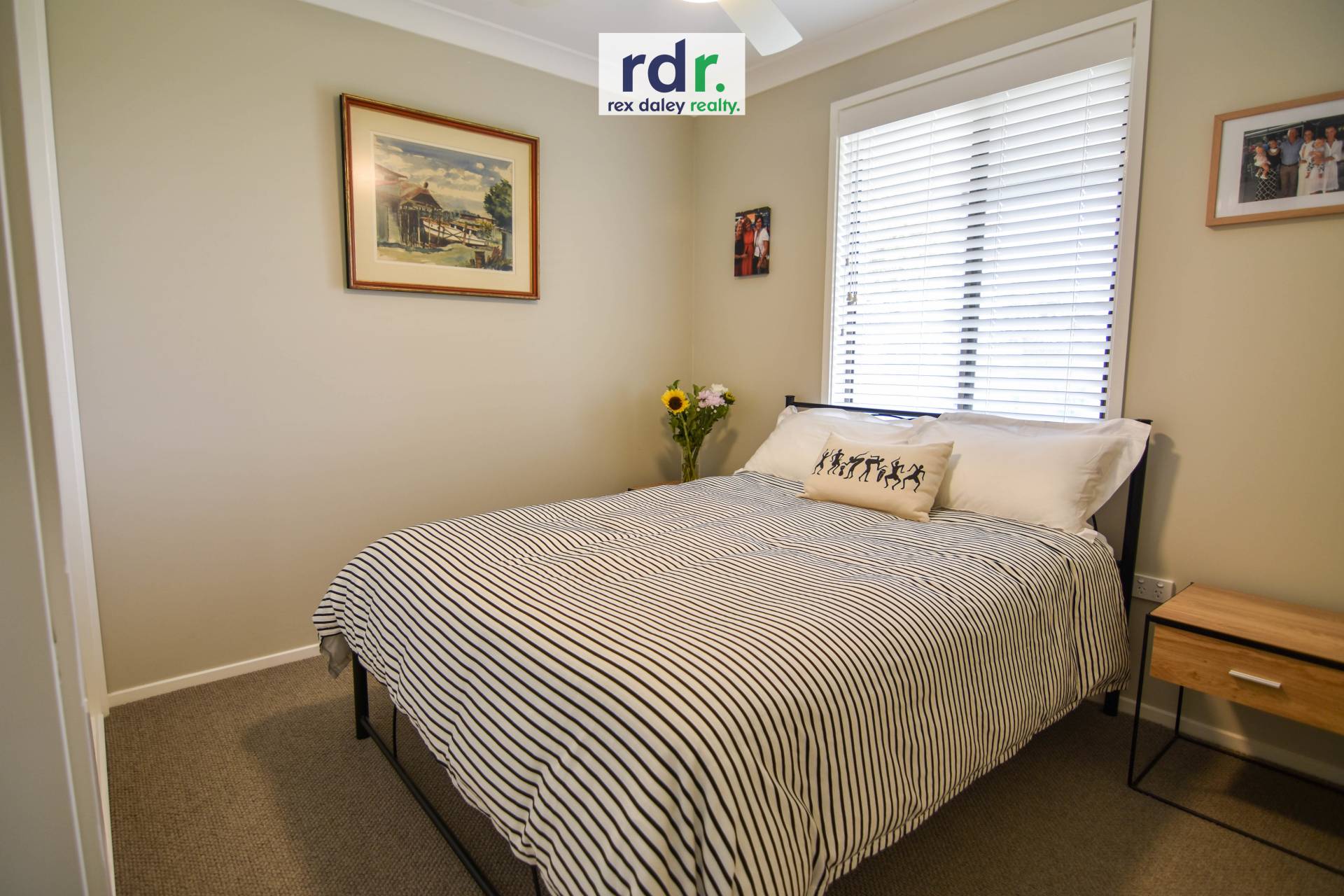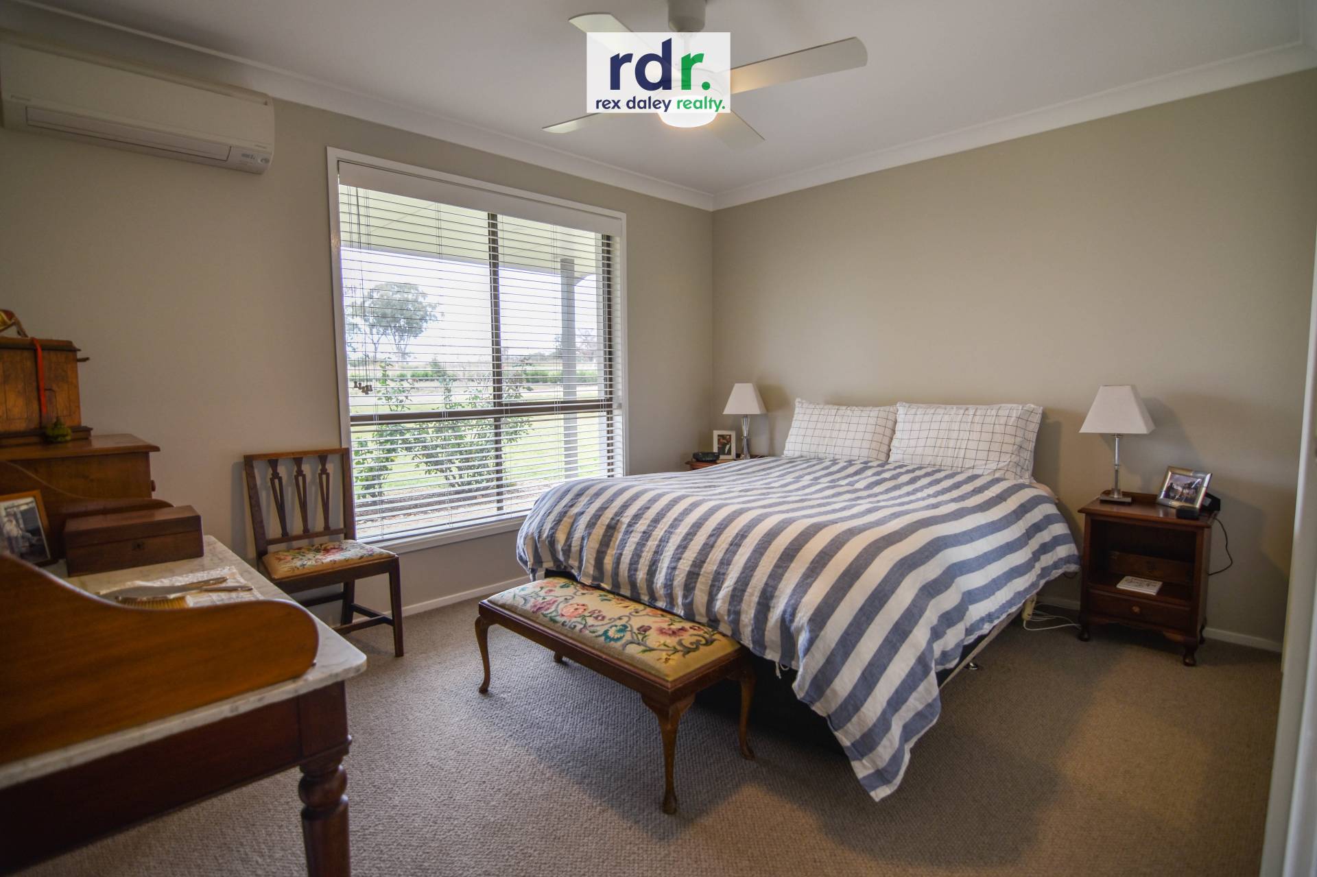 4 carpeted bedrooms, all with ceiling fans and built-in robes with the main bedroom also having a reverse cycle air conditioner.