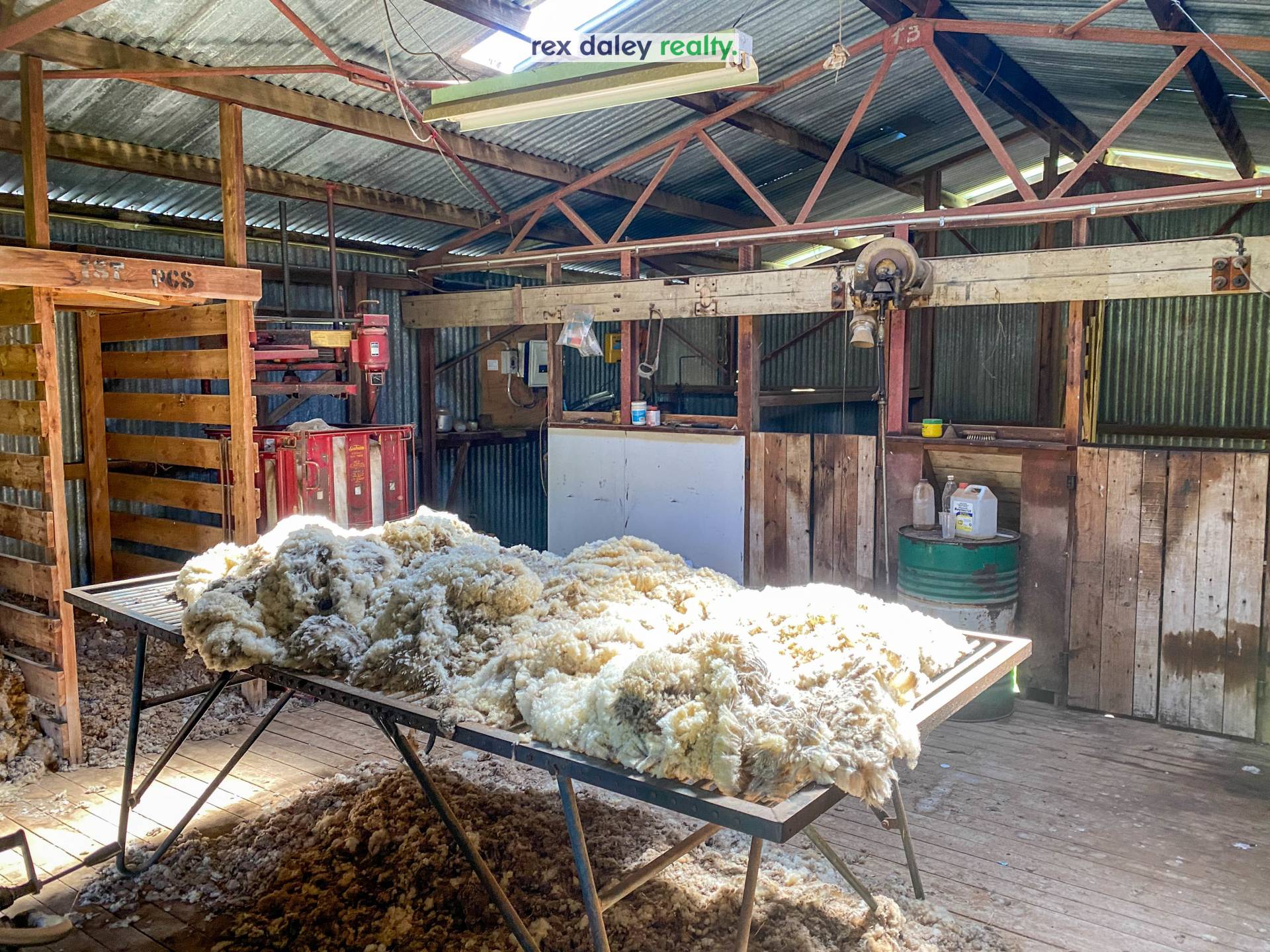 WOOL SHED:  2 stand electric shearing shed with 2 skillions, wool table and press. Quick fill water outlet.