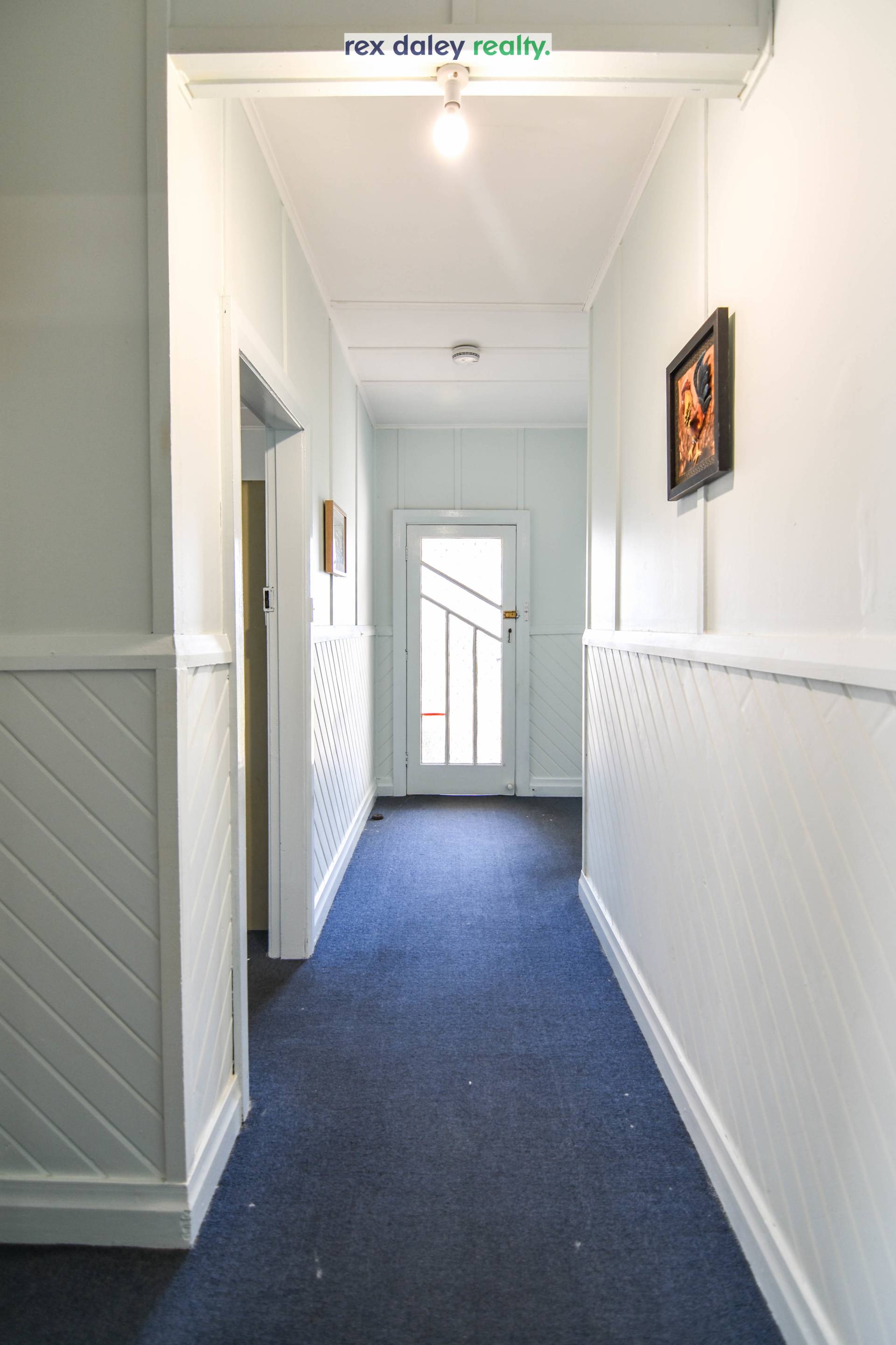 Wide hallway lined with traditional wainscotting leads you to the comfortable lounge room with reverse cycle air conditioner.