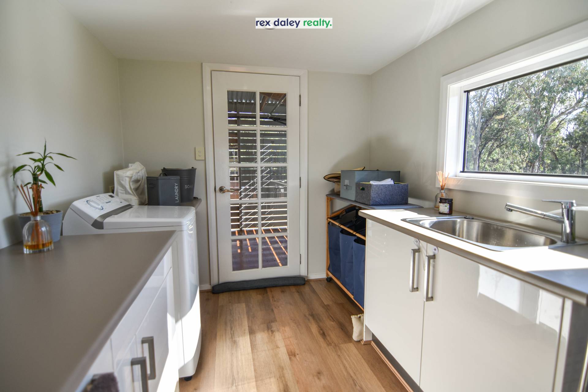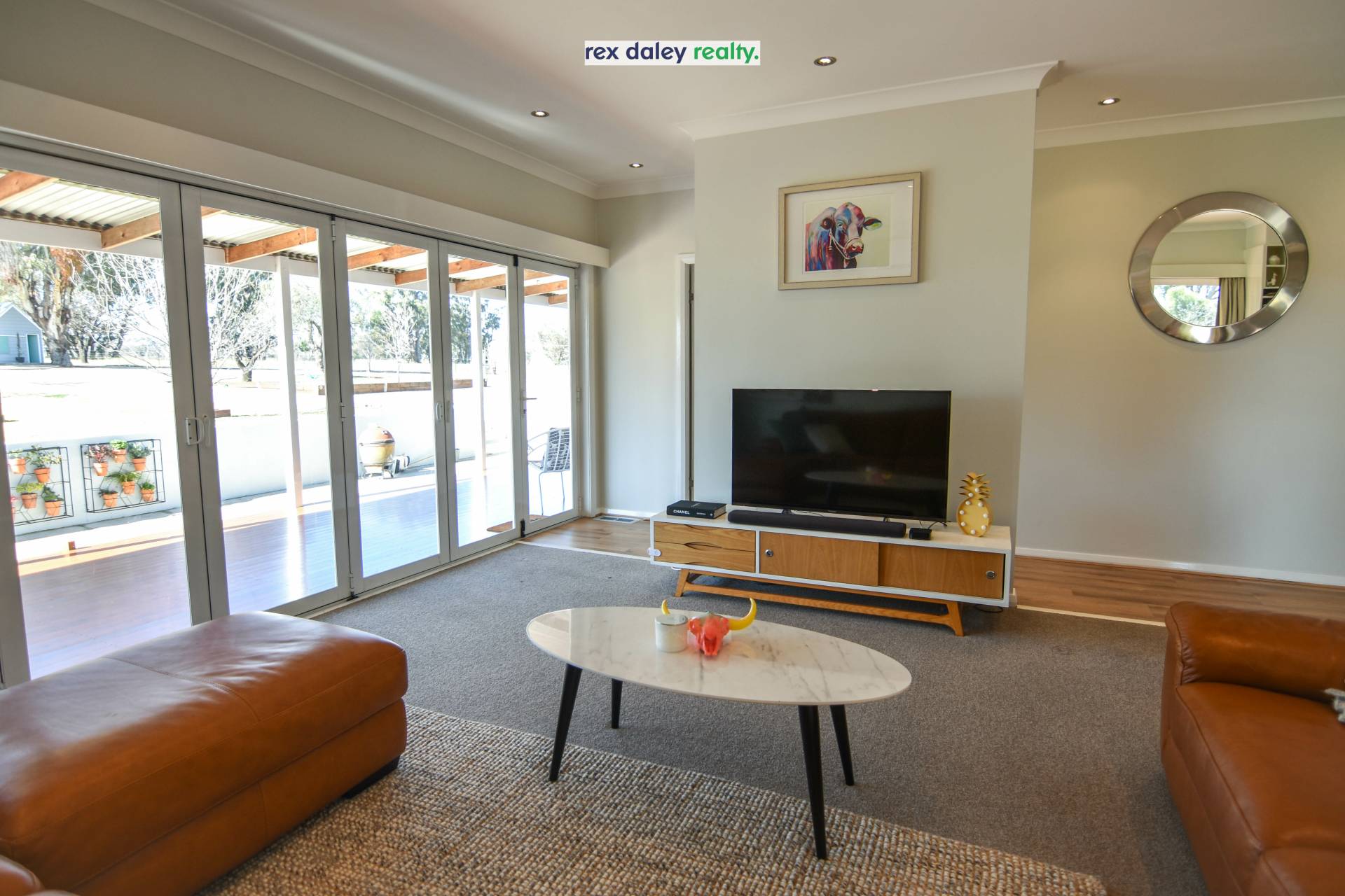 Cosy, comfortable and carpeted lounge room has concertina glass doors opening to the wraparound timber verandah, merging the indoors and outdoors to become one large living space.