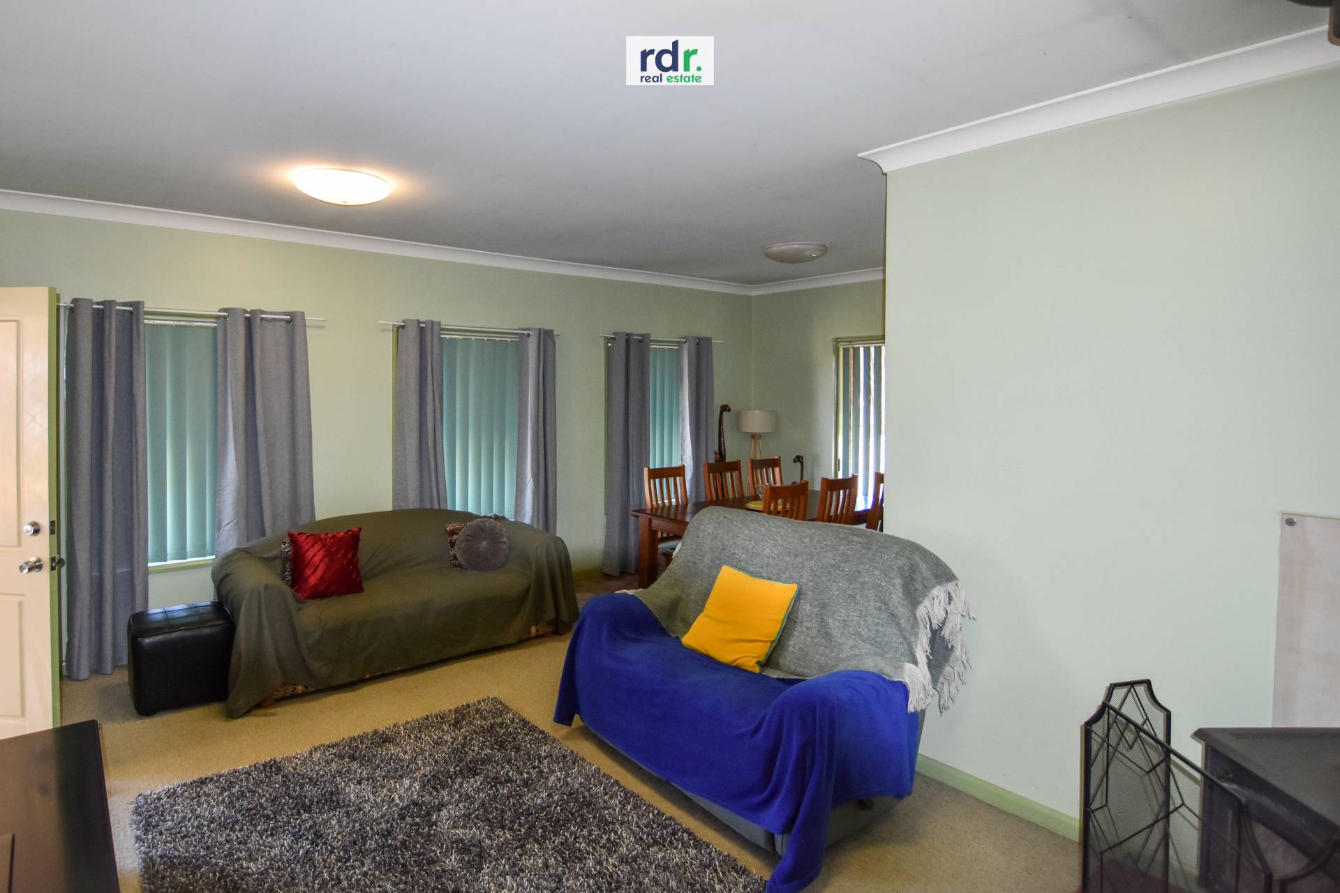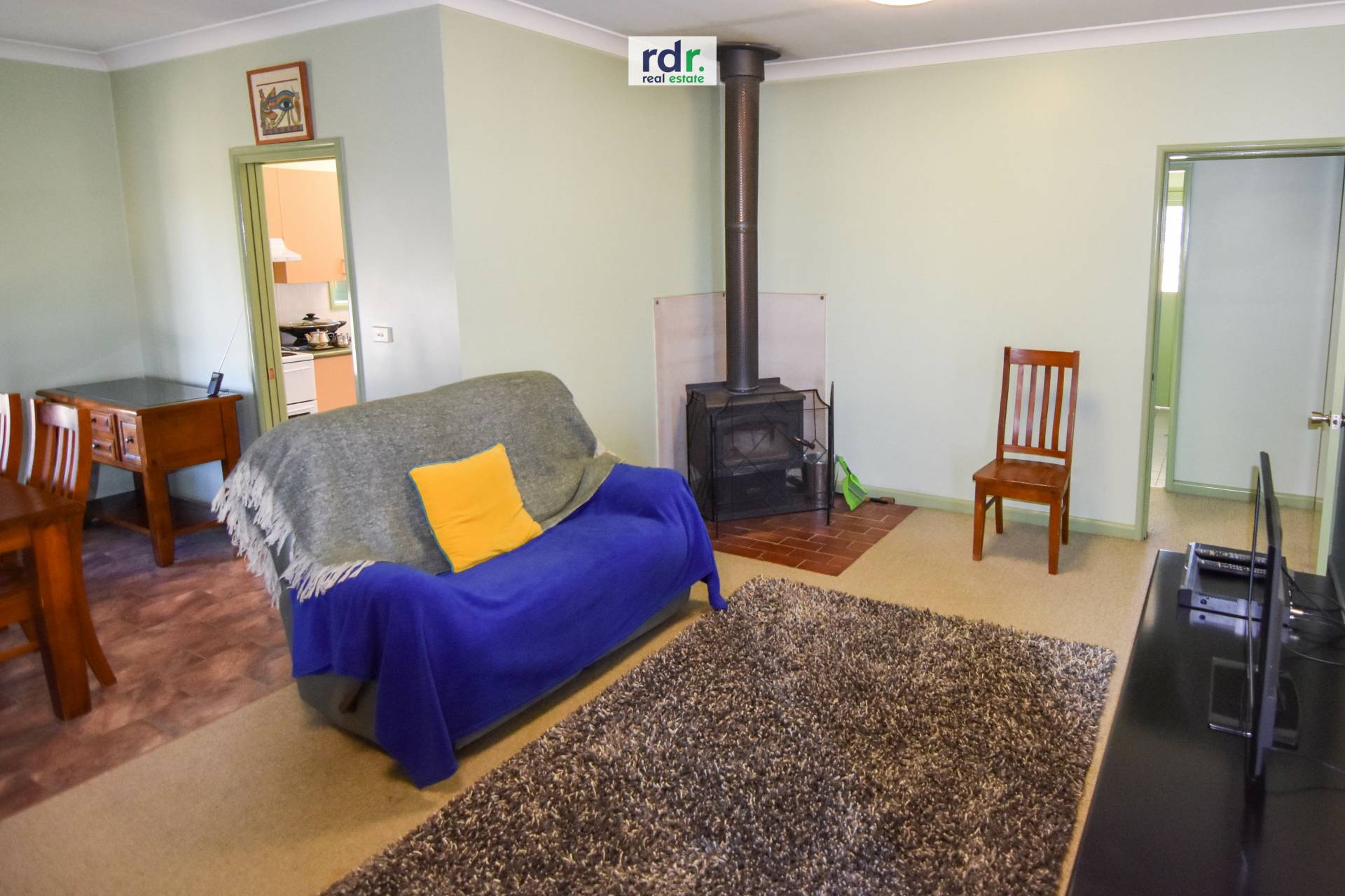 Lounge and dining room with wood heater provides a great space for relaxation and family mealtimes.