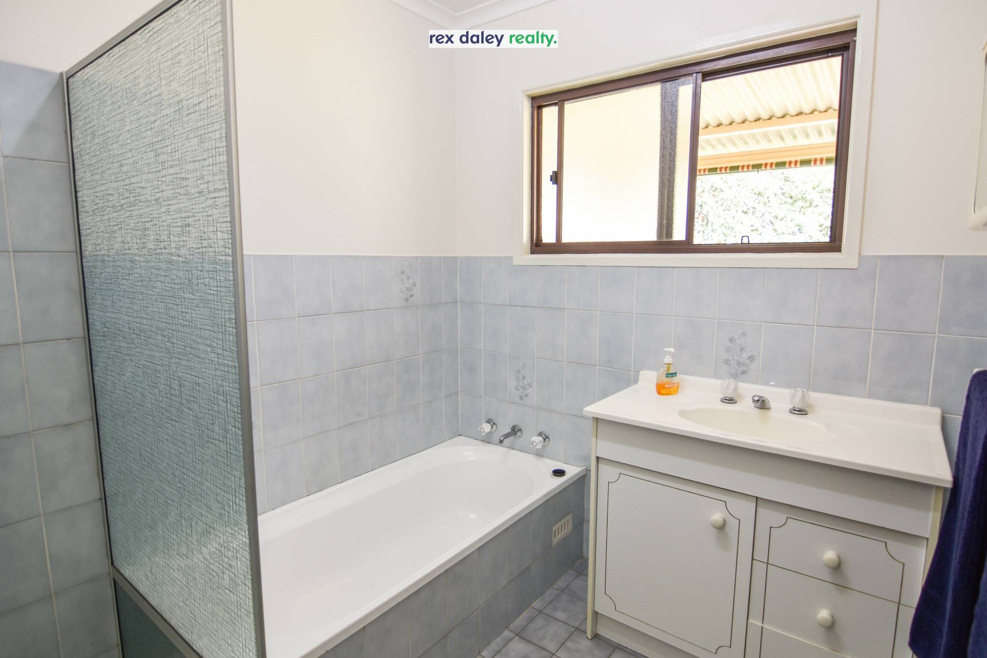 Tiled bathroom is central to all bedrooms and contains bathtub, shower, vanity and separate toilet.