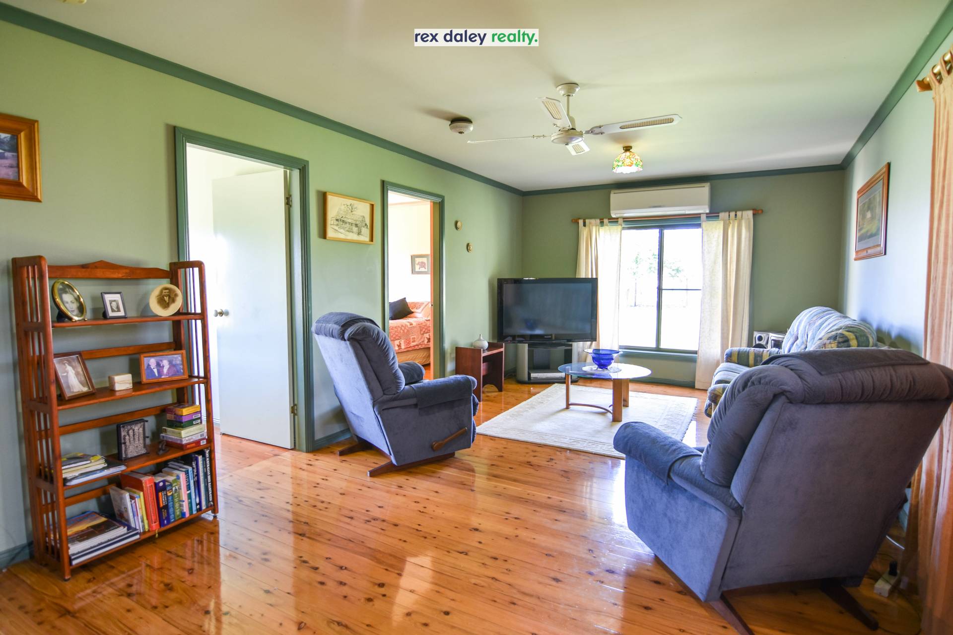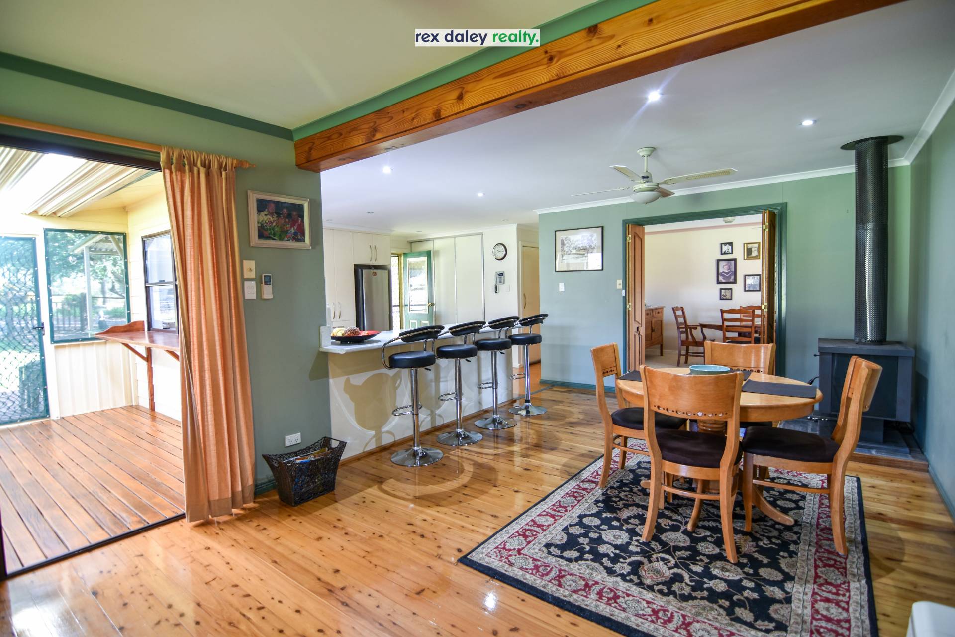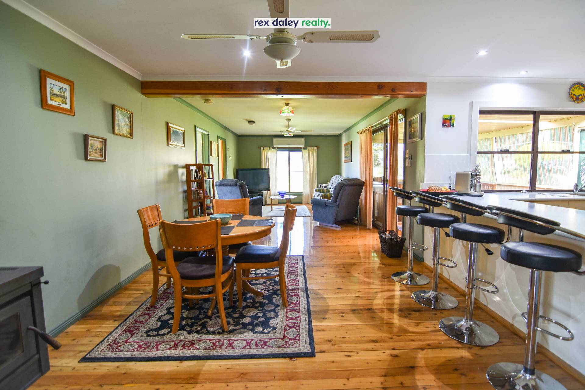 Open plan lounge, dining and kitchen area are the central hub of this home, and where everyone will come together. In winter, dine by the ambiance of the wood heater, while reverse cycle air conditioner and ceiling fans will keep you cool in summer. Polished timber floors are a real feature in this room.