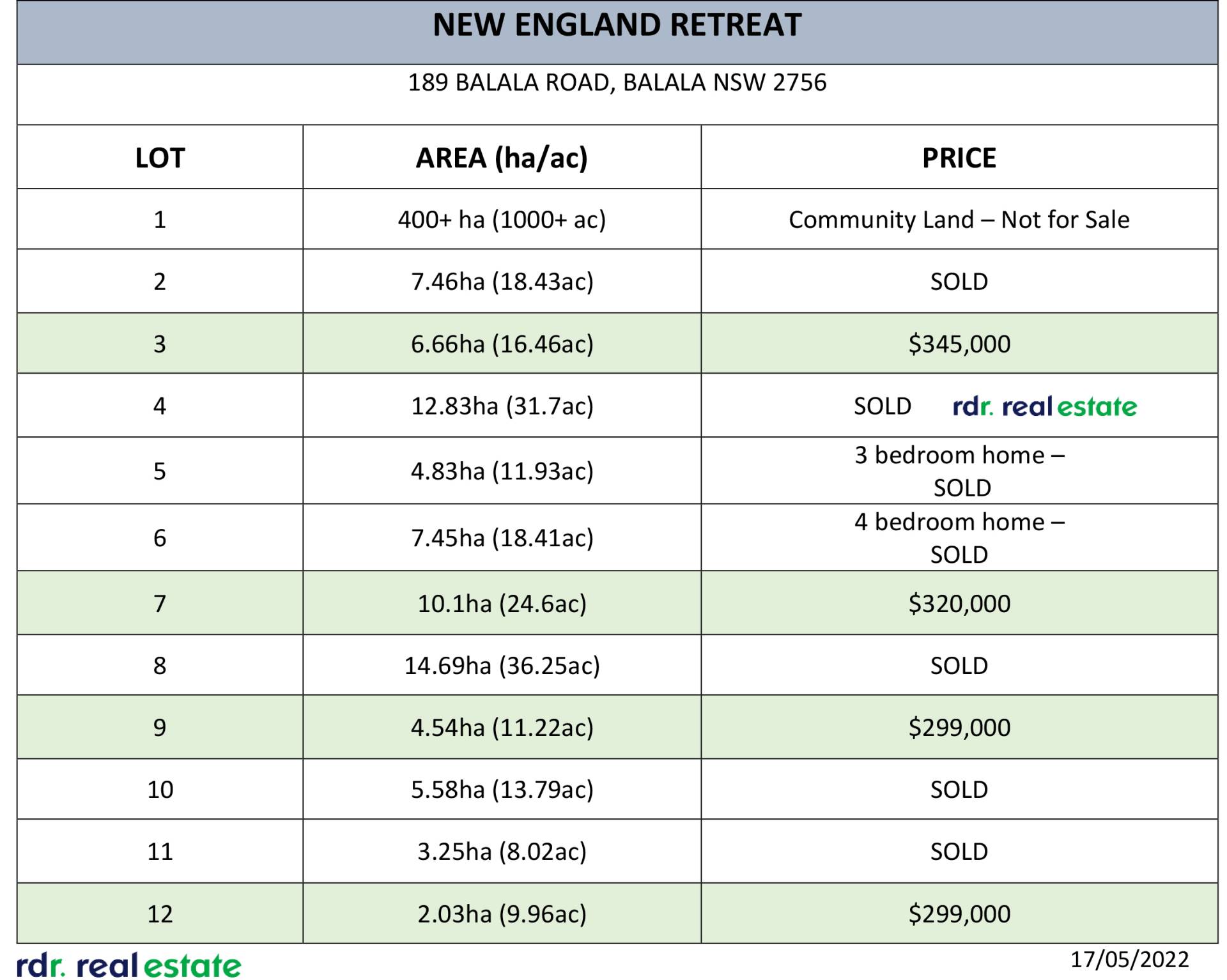 Located 20km from Uralla, 40km from Armidale and 100km from Tamworth, the New England Retreat is made up of 12 lots, including 11 Torrens title blocks and a shared neighbourhood property block.