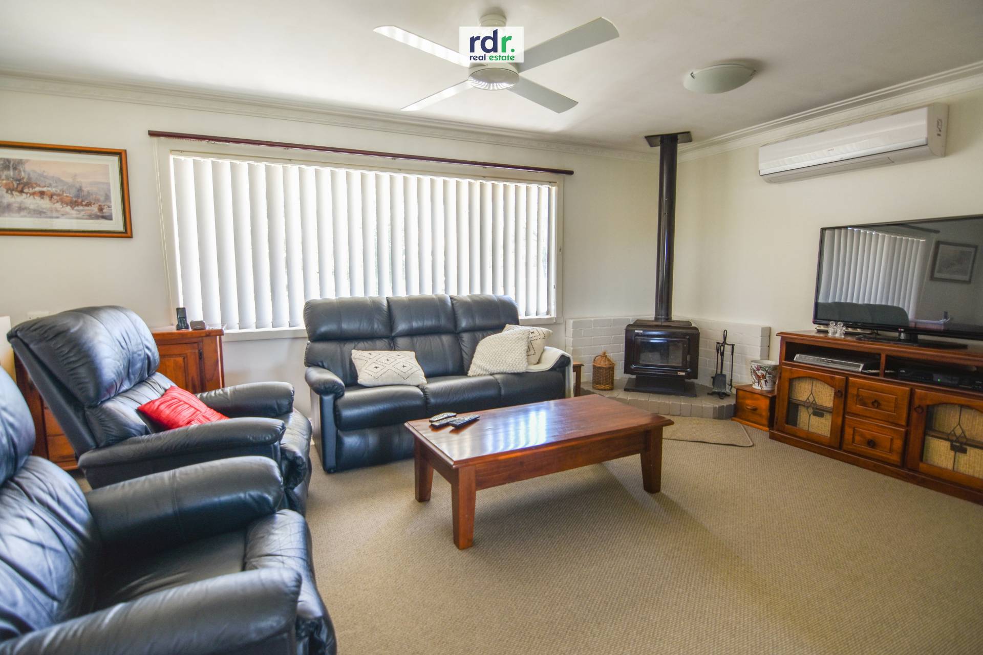 Sunny lounge room where you can relax by the wood heater in winter or keep cool in the warmer months by the ceiling fan and reverse cycle AC