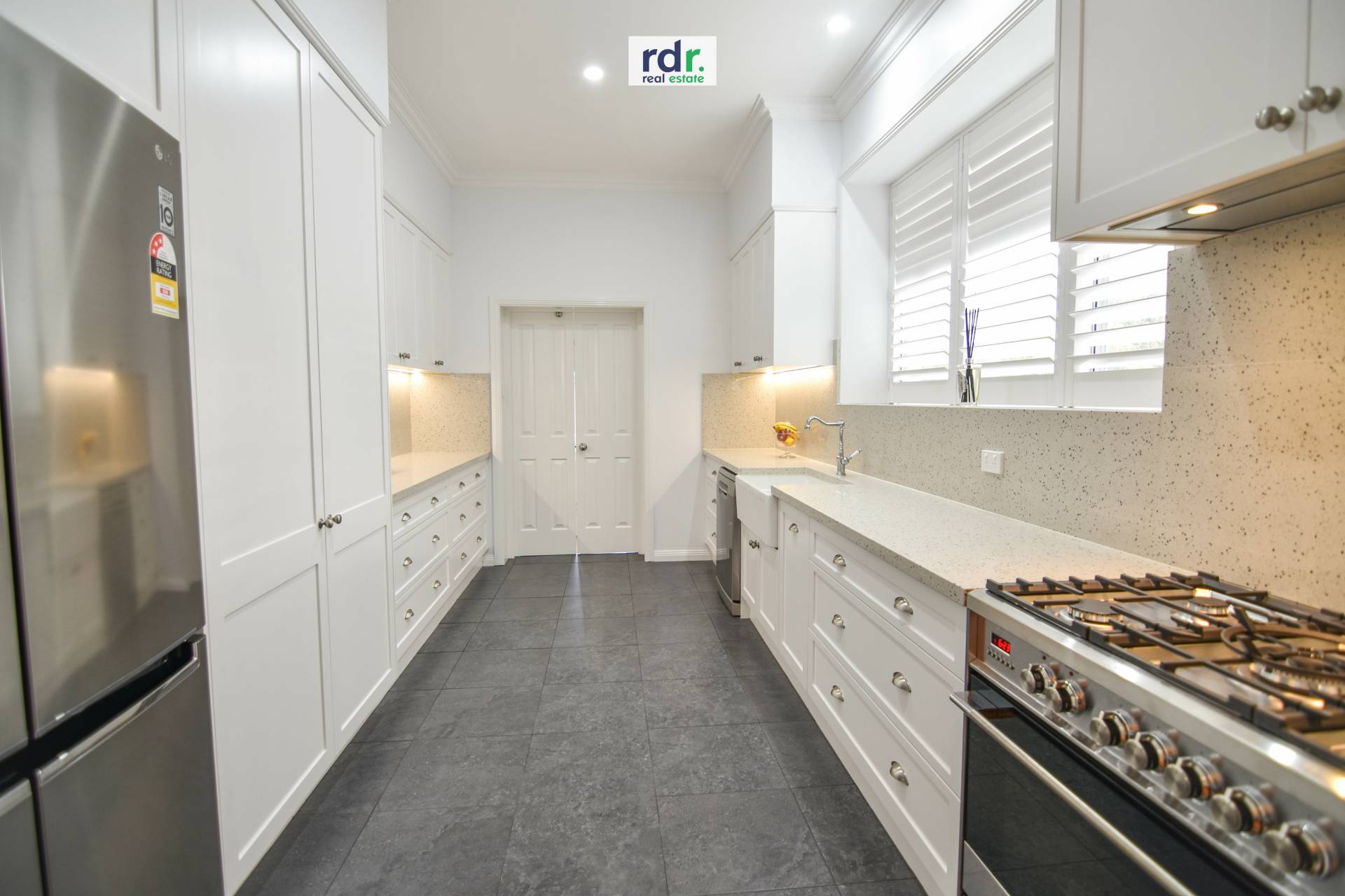 Beautifully designed and sleek galley kitchen will meet all your modern expectations, while still honouring the heritage and style of the home. An abundance of storage, stone bench tops, dishwasher, double ceramic farm sink, large 900mm stove, and a classic grey and white colour palette.